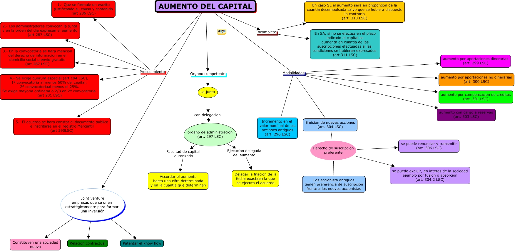 Este Cmap, tiene información relacionada con: BLUE TRANSPARENCE, AUMENTO DEL CAPITAL Modalidades aumento con cargo a reservas (art. 303 LSC), AUMENTO DEL CAPITAL Procedimiento 2.- Los administradores convocan la junta y en la orden del dia expresan el aumento (art 287 LSC), AUMENTO DEL CAPITAL Modalidades aumento por aportaciones dinerarias (art. 299 LSC), AUMENTO DEL CAPITAL Procedimiento 4.- Se exige quorum especial (art 194 LSC), 1ª convocatoria al menos 50% del capital, 2ª convocatoriaal menos el 25%. Se exige mayoria ordinaria o 2/3 en 2ª convocatoria (art 201 LSC), Emision de nuevas acciones (art. 304 LSC) Derecho de suscripcion preferente se puede excluir, en interes de la sociedad ejemplo por fusion o absorcion (art. 304.2 LSC), AUMENTO DEL CAPITAL Modalidades Emision de nuevas acciones (art. 304 LSC), AUMENTO DEL CAPITAL Joint venture empresas que se unen estratégicamente para formar una inversión Patentar el know how, AUMENTO DEL CAPITAL Modalidades aumento por aportaciones no dinerarias (art. 300 LSC), AUMENTO DEL CAPITAL Modalidades Incremento en el valor nominal de las acciones antiguas (art. 296 LSC), AUMENTO DEL CAPITAL Modalidades aumento por compensacion de creditos (art. 301 LSC), AUMENTO DEL CAPITAL Joint venture empresas que se unen estratégicamente para formar una inversión Relacion contractual, La junta con delegacion organo de administracion (art. 297 LSC), AUMENTO DEL CAPITAL Organo competente La junta, AUMENTO DEL CAPITAL Joint venture empresas que se unen estratégicamente para formar una inversión Constituyen una sociedad nueva, organo de administracion (art. 297 LSC) Facultad de capital autorizado Accordar el aumento hasta una cifra determinada y en la cuantia que determinen, organo de administracion (art. 297 LSC) Ejecucion delegada del aumento Delagar la fijacion de la fecha exactaen la que se ejecuta el acuerdo, Emision de nuevas acciones (art. 304 LSC) Derecho de suscripcion preferente se puede renunciar y transmitir (art. 306 LSC), AUMENTO DEL CAPITAL Incompleto En SA, si no se efectua en el plazo indicado el capital se aumenta en cuantia de las suscripciones efectuadas si las condiciones se hubieran expresados. (art 311 LSC), AUMENTO DEL CAPITAL Procedimiento 5.- El acuerdo se hara constar el documento publico e inscribirse en el registro Mercantil (art 290LSC), AUMENTO DEL CAPITAL Procedimiento 1.- Que se formule un escrito justificando su causa y contenido (art 286 LSC)