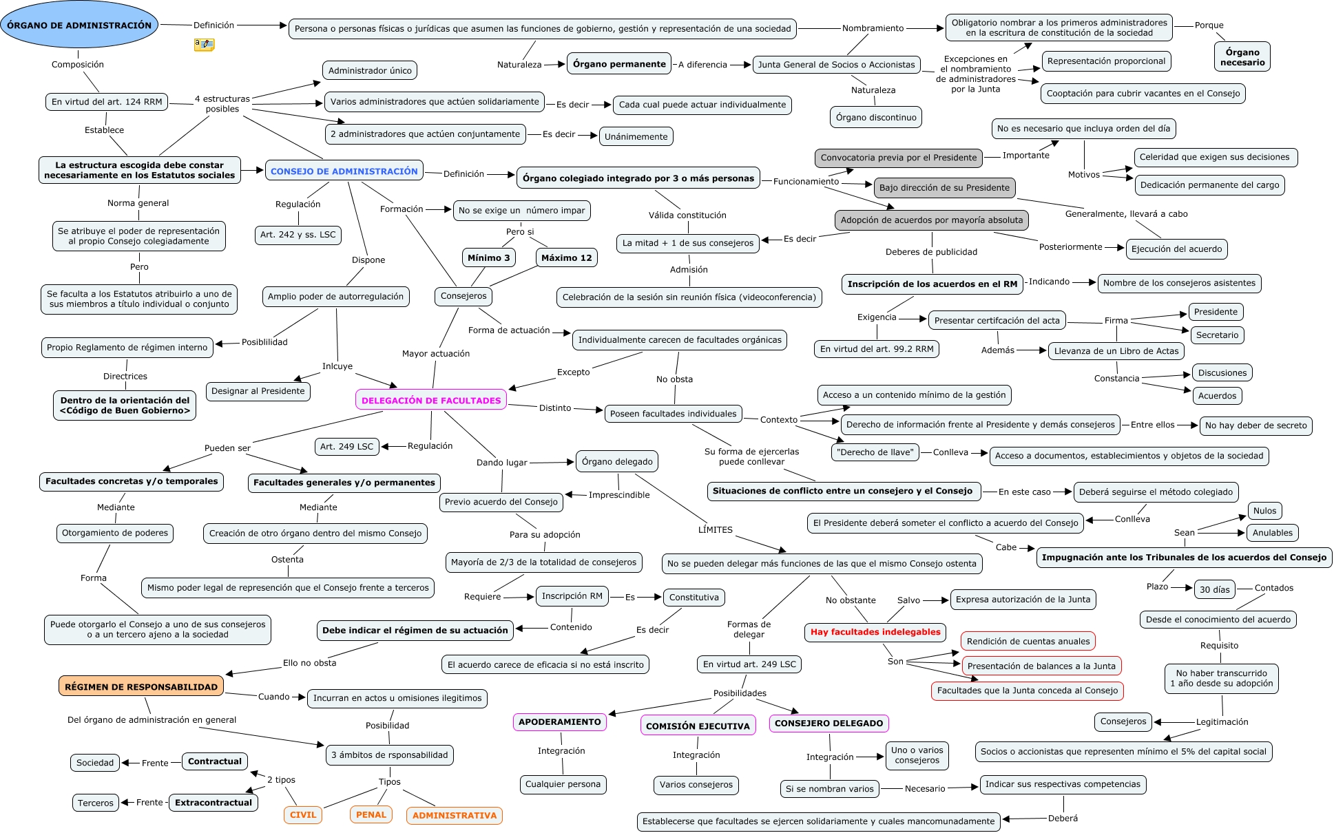 Este Cmap, tiene información relacionada con: Escenario 9, Consejeros Forma de actuación Individualmente carecen de facultades orgánicas, Órgano permanente A diferencia Junta General de Socios o Accionistas, Hay facultades indelegables Salvo Expresa autorización de la Junta, Llevanza de un Libro de Actas Constancia Discusiones, DELEGACIÓN DE FACULTADES Distinto Poseen facultades individuales, CIVIL 2 tipos Contractual, En virtud del art. 124 RRM 4 estructuras posibles La estructura escogida debe constar necesariamente en los Estatutos sociales, Debe indicar el régimen de su actuación Ello no obsta RÉGIMEN DE RESPONSABILIDAD, Órgano delegado LÍMITES No se pueden delegar más funciones de las que el mismo Consejo ostenta, DELEGACIÓN DE FACULTADES Dando lugar Órgano delegado, Adopción de acuerdos por mayoría absoluta Es decir La mitad + 1 de sus consejeros, No se exige un número impar Pero si Mínimo 3, La mitad + 1 de sus consejeros Admisión Celebración de la sesión sin reunión física (videoconferencia), Inscripción de los acuerdos en el RM Indicando Nombre de los consejeros asistentes, Impugnación ante los Tribunales de los acuerdos del Consejo Sean Nulos, CONSEJO DE ADMINISTRACIÓN Regulación Art. 242 y ss. LSC, CONSEJO DE ADMINISTRACIÓN Formación Consejeros, Mayoría de 2/3 de la totalidad de consejeros Requiere Inscripción RM, Situaciones de conflicto entre un consejero y el Consejo En este caso Deberá seguirse el método colegiado, Inscripción RM Contenido Debe indicar el régimen de su actuación