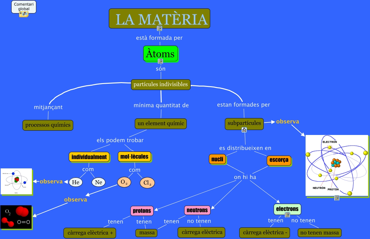 Aquest mapa conceptual conté informació relacionada amb: organització materia2, escorça on hi ha electrons, neutrons no tenen càrrega elèctrica, electrons no tenen no tenen massa, He observa, partícules indivisibles estan formades per subpartícules, mol·lècules com <math xmlns="http://www.w3.org/1998/Math/MathML"> <mrow> <mmultiscripts> <mtext> O </mtext> <mtext> 2 </mtext> <none/> </mmultiscripts> </mrow> </math>, nucli on hi ha neutrons, individualment com He, nucli on hi ha electrons, escorça on hi ha protons, nucli on hi ha protons, individualment com Ne, partícules indivisibles mínima quantitat de un element químic, un element químic els podem trobar mol·lècules, un element químic els podem trobar individualment, partícules indivisibles mitjançant processos químics, Àtoms són partícules indivisibles, <math xmlns="http://www.w3.org/1998/Math/MathML"> <mrow> <mmultiscripts> <mtext> O </mtext> <mtext> 2 </mtext> <none/> </mmultiscripts> </mrow> </math> observa, escorça on hi ha neutrons, subpartícules es distribueixen en nucli