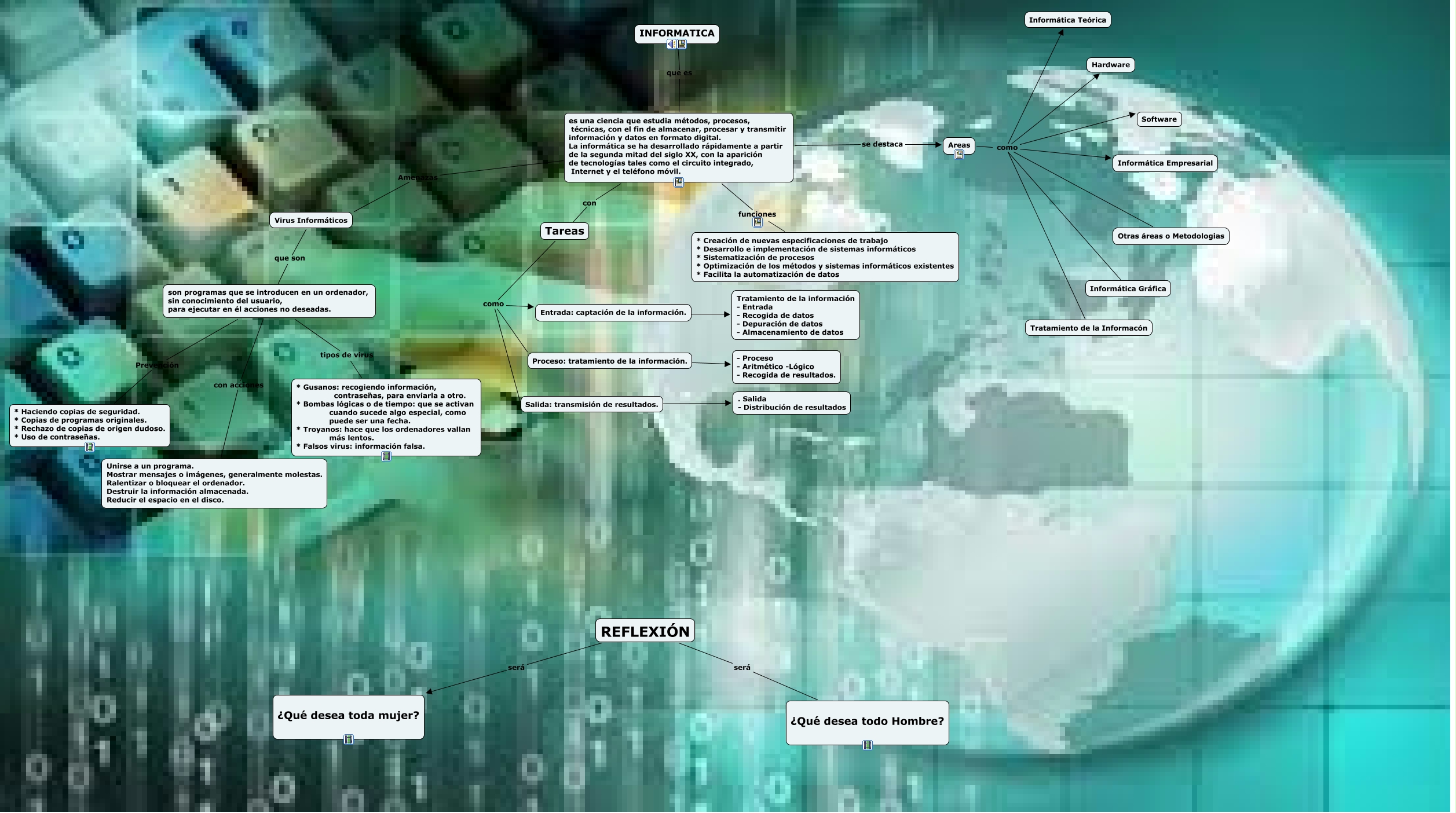 Este Cmap, tiene información relacionada con: Informatica, INFORMATICA que es es una ciencia que estudia métodos, procesos, técnicas, con el fin de almacenar, procesar y transmitir información y datos en formato digital. La informática se ha desarrollado rápidamente a partir de la segunda mitad del siglo XX, con la aparición de tecnologías tales como el circuito integrado, Internet y el teléfono móvil., es una ciencia que estudia métodos, procesos, técnicas, con el fin de almacenar, procesar y transmitir información y datos en formato digital. La informática se ha desarrollado rápidamente a partir de la segunda mitad del siglo XX, con la aparición de tecnologías tales como el circuito integrado, Internet y el teléfono móvil. funciones * Creación de nuevas especificaciones de trabajo * Desarrollo e implementación de sistemas informáticos * Sistematización de procesos * Optimización de los métodos y sistemas informáticos existentes * Facilita la automatización de datos, Areas como Tratamiento de la Informacón, REFLEXIÓN será ¿Qué desea todo Hombre?, es una ciencia que estudia métodos, procesos, técnicas, con el fin de almacenar, procesar y transmitir información y datos en formato digital. La informática se ha desarrollado rápidamente a partir de la segunda mitad del siglo XX, con la aparición de tecnologías tales como el circuito integrado, Internet y el teléfono móvil. Amenazas Virus Informáticos, Areas como Informática Teórica, es una ciencia que estudia métodos, procesos, técnicas, con el fin de almacenar, procesar y transmitir información y datos en formato digital. La informática se ha desarrollado rápidamente a partir de la segunda mitad del siglo XX, con la aparición de tecnologías tales como el circuito integrado, Internet y el teléfono móvil. se destaca Areas, Areas como Informática Empresarial, REFLEXIÓN será ¿Qué desea toda mujer?, Tareas como Salida: transmisión de resultados., Tareas como Proceso: tratamiento de la información., Virus Informáticos que son son programas que se introducen en un ordenador, sin conocimiento del usuario, para ejecutar en él acciones no deseadas., Areas como Hardware, Areas como Software, es una ciencia que estudia métodos, procesos, técnicas, con el fin de almacenar, procesar y transmitir información y datos en formato digital. La informática se ha desarrollado rápidamente a partir de la segunda mitad del siglo XX, con la aparición de tecnologías tales como el circuito integrado, Internet y el teléfono móvil. con Tareas, son programas que se introducen en un ordenador, sin conocimiento del usuario, para ejecutar en él acciones no deseadas. con acciones Unirse a un programa. Mostrar mensajes o imágenes, generalmente molestas. Ralentizar o bloquear el ordenador. Destruir la información almacenada. Reducir el espacio en el disco., son programas que se introducen en un ordenador, sin conocimiento del usuario, para ejecutar en él acciones no deseadas. Prevención * Haciendo copias de seguridad. * Copias de programas originales. * Rechazo de copias de origen dudoso. * Uso de contraseñas., son programas que se introducen en un ordenador, sin conocimiento del usuario, para ejecutar en él acciones no deseadas. tipos de virus * Gusanos: recogiendo información, contraseñas, para enviarla a otro. * Bombas lógicas o de tiempo: que se activan cuando sucede algo especial, como puede ser una fecha. * Troyanos: hace que los ordenadores vallan más lentos. * Falsos virus: información falsa., Salida: transmisión de resultados. ???? . Salida - Distribución de resultados, Areas como Informática Gráfica