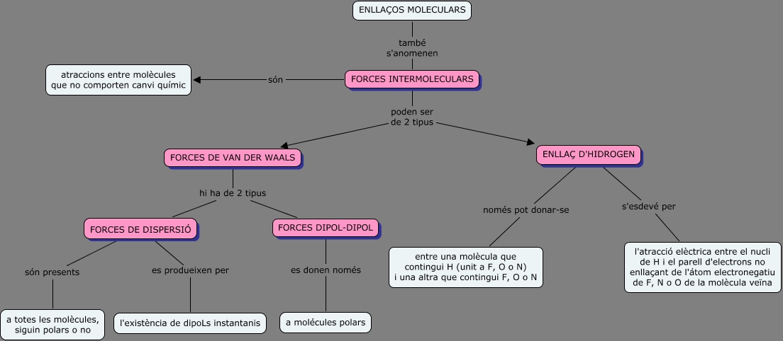 Aquest mapa conceptual conté informació relacionada amb: TASCA 4 - FORCES INTERMOLECULARS, FORCES DE DISPERSIÓ són presents a totes les molècules, siguin polars o no, FORCES INTERMOLECULARS poden ser de 2 tipus ENLLAÇ D'HIDROGEN, ENLLAÇOS MOLECULARS també s'anomenen FORCES INTERMOLECULARS, FORCES INTERMOLECULARS són atraccions entre molècules que no comporten canvi químic, FORCES DE DISPERSIÓ es produeixen per l'existència de dipoLs instantanis, ENLLAÇ D'HIDROGEN només pot donar-se entre una molècula que contingui H (unit a F, O o N) i una altra que contingui F, O o N, FORCES DE VAN DER WAALS hi ha de 2 tipus FORCES DIPOL-DIPOL, FORCES DIPOL-DIPOL es donen només a molécules polars, FORCES INTERMOLECULARS poden ser de 2 tipus FORCES DE VAN DER WAALS, FORCES DE VAN DER WAALS hi ha de 2 tipus FORCES DE DISPERSIÓ, ENLLAÇ D'HIDROGEN s'esdevé per l'atracció elèctrica entre el nucli de H i el parell d'electrons no enllaçant de l'átom electronegatiu de F, N o O de la molècula veïna
