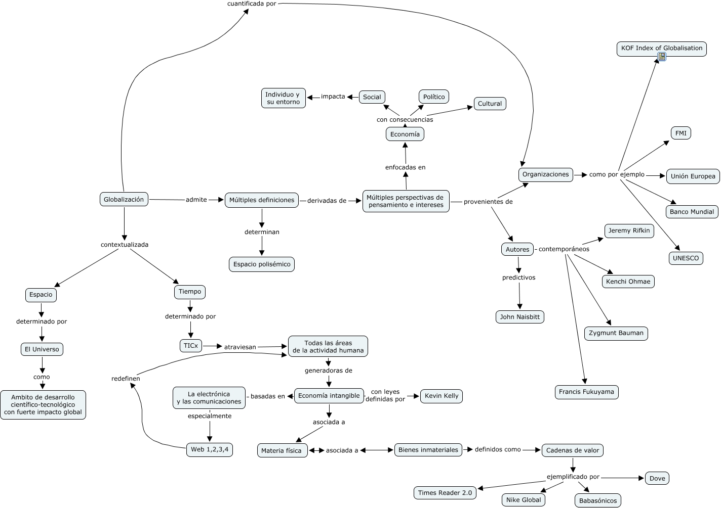 Este Cmap, tiene información relacionada con: Tecnología y Globalización, Autores predictivos John Naisbitt, Organizaciones como por ejemplo Banco Mundial, Economía con consecuencias Social, Cadenas de valor ejemplificado por Babasónicos, Todas las áreas de la actividad humana generadoras de Economía intangible, Autores contemporáneos Francis Fukuyama, Organizaciones como por ejemplo UNESCO, Economía con consecuencias Político, La electrónica y las comunicaciones especialmente Web 1,2,3,4, Globalización admite Múltiples definiciones, Múltiples perspectivas de pensamiento e intereses provenientes de Autores, Cadenas de valor ejemplificado por Nike Global, Materia física asociada a Bienes inmateriales, Social impacta Individuo y su entorno, Múltiples definiciones determinan Espacio polisémico, Autores contemporáneos Jeremy Rifkin, Organizaciones como por ejemplo Unión Europea, Globalización contextualizada Tiempo, El Universo como Ambito de desarrollo científico-tecnológico con fuerte impacto global, Bienes inmateriales definidos como Cadenas de valor