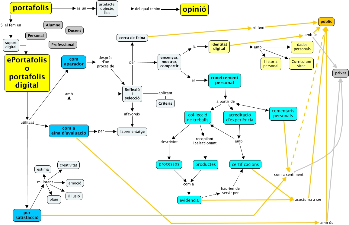 Aquest mapa conceptual conté informació relacionada amb: proposta, acreditació d'experiència amb certificacions, evidència acostuma a ser públic, com a eina d'avaluació amb ús privat, col·lecció de treballs recopilant i seleccionant productes, artefacte, objecte, lloc del qual tenim opinió, Reflexió i selecció aplicant Criteris, evidència haurien de servir per certificacions, com a eina d'avaluació amb ús públic, processos com a evidència, suport digital l'anomenem ePortafolis o portafolis digital, per satisfacció com a sentiment públic, identitat digital amb història personal, identitat digital amb ús públic, portafolis Si el fem en suport digital, comentaris personals com a sentiment públic, identitat digital amb ús privat, col·lecció de treballs descrivint processos, com aparador després d'un procés de Reflexió i selecció, Reflexió i selecció per cerca de feina, ensenyar, mostrar, compartir el coneixement personal