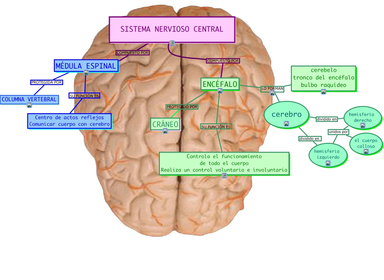 Este Cmap, tiene información relacionada con: SISTEMA NERVIOSO CENTRAL, hemisferio derecho unidos por hemisferio izquierdo, SISTEMA NERVIOSO CENTRAL COMPUESTO POR MÉDULA ESPINAL, SISTEMA NERVIOSO CENTRAL COMPUESTO POR ENCÉFALO, cerebro dividido en hemisferio derecho, hemisferio derecho unidos por el cuerpo calloso, ENCÉFALO PROTEGIDO POR CRÁNEO, ENCÉFALO LO FORMAN cerebelo tronco del encéfalo bulbo raquídeo, ENCÉFALO LO FORMAN cerebro, MÉDULA ESPINAL PROTEGIDA POR COLUMNA VERTEBRAL, cerebro dividido en hemisferio izquierdo, MÉDULA ESPINAL SU FUNCIÓN ES Centro de actos reflejos Comunicar cuerpo con cerebro, ENCÉFALO SU FUNCIÓN ES Controla el funcionamiento de todo el cuerpo Realiza un control voluntario e involuntario