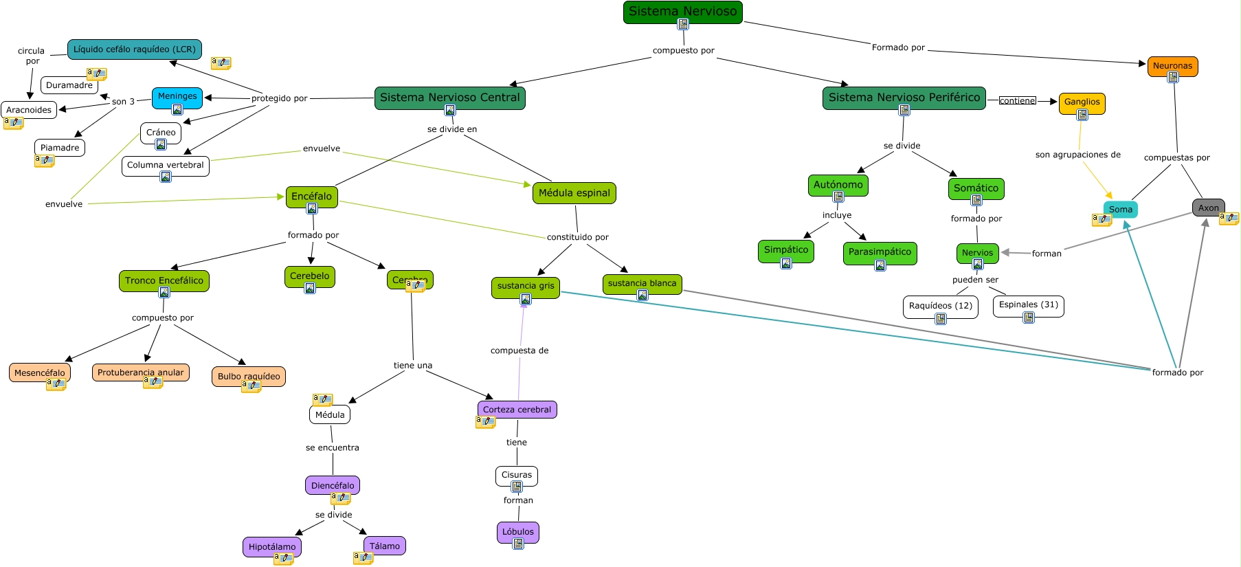 Este Cmap, tiene información relacionada con: Sistema Nervioso Valentina Hepp, Nervios pueden ser Raquídeos (12), Sistema Nervioso compuesto por Sistema Nervioso Periférico, Sistema Nervioso Central se divide en Médula espinal, Columna vertebral envuelve Médula espinal, sustancia blanca formado por Soma, Axon forman Nervios, Sistema Nervioso Periférico se divide Autónomo, Médula se encuentra Diencéfalo, Cráneo envuelve Encéfalo, Cerebro tiene una Médula, Diencéfalo se divide Tálamo, Sistema Nervioso Periférico se divide Somático, Nervios pueden ser Espinales (31), Autónomo incluye Parasimpático, Médula espinal constituido por sustancia blanca, Sistema Nervioso Central protegido por Líquido cefálo raquídeo (LCR), Sistema Nervioso Central protegido por Meninges, Sistema Nervioso Periférico contiene Ganglios, Neuronas compuestas por Soma, Tronco Encefálico compuesto por Mesencéfalo