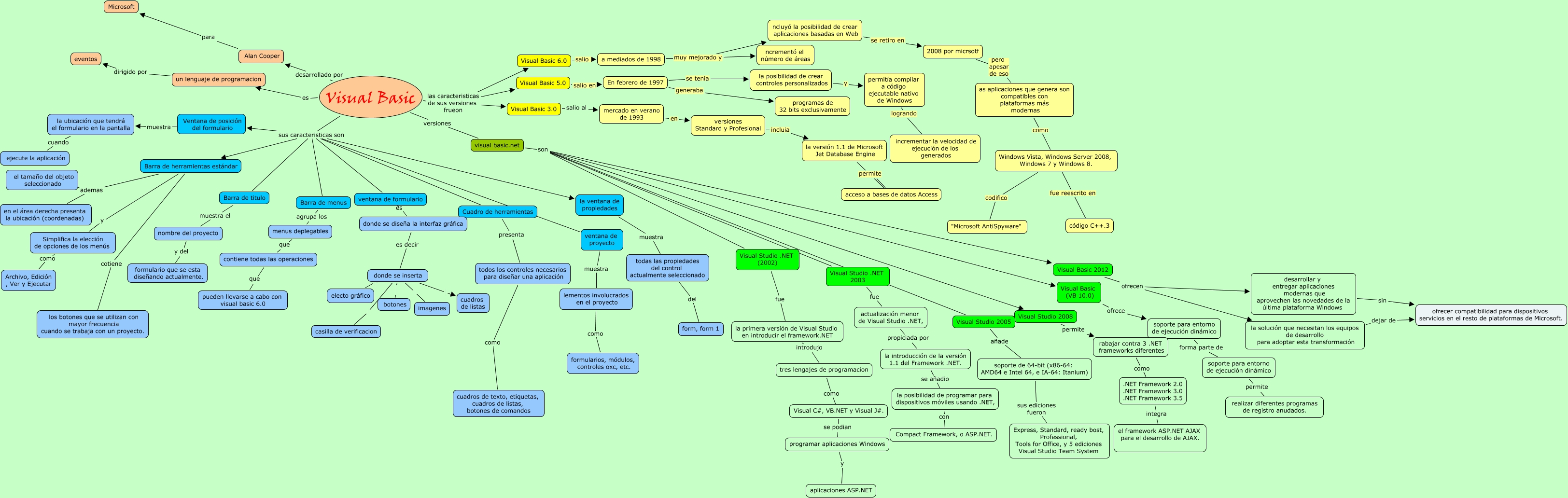 Este Cmap, tiene información relacionada con: SALA_1_PC21_Maria Paula Cruz Ramos 095trabajo informatica, visual basic.net son Visual Studio .NET 2003, Alan Cooper para Microsoft, Windows Vista, Windows Server 2008, Windows 7 y Windows 8. codifico "Microsoft AntiSpyware", Visual Basic sus caracteristicas son la ventana de propiedades, un lenguaje de programacion dirigido por eventos, ventana de proyecto muestra lementos involucrados en el proyecto, donde se inserta botones, Barra de herramientas estándar cotiene los botones que se utilizan con mayor frecuencia cuando se trabaja con un proyecto., Barra de herramientas estándar y Simplifica la elección de opciones de los menús, Visual Basic 5.0 salio en En febrero de 1997, donde se inserta casilla de verificacion, Visual Studio .NET (2002) fue la primera versión de Visual Studio en introducir el framework.NET, Visual Basic las caracteristicas de sus versiones frueon Visual Basic 5.0, Windows Vista, Windows Server 2008, Windows 7 y Windows 8. fue reescrito en código C++.3, electo gráfico donde se inserta, permitía compilar a código ejecutable nativo de Windows logrando incrementar la velocidad de ejecución de los generados, Visual Basic 3.0 salio al mercado en verano de 1993, Visual Basic sus caracteristicas son ventana de formulario, Barra de herramientas estándar ademas el tamaño del objeto seleccionado, Barra de menus agrupa los menus deplegables