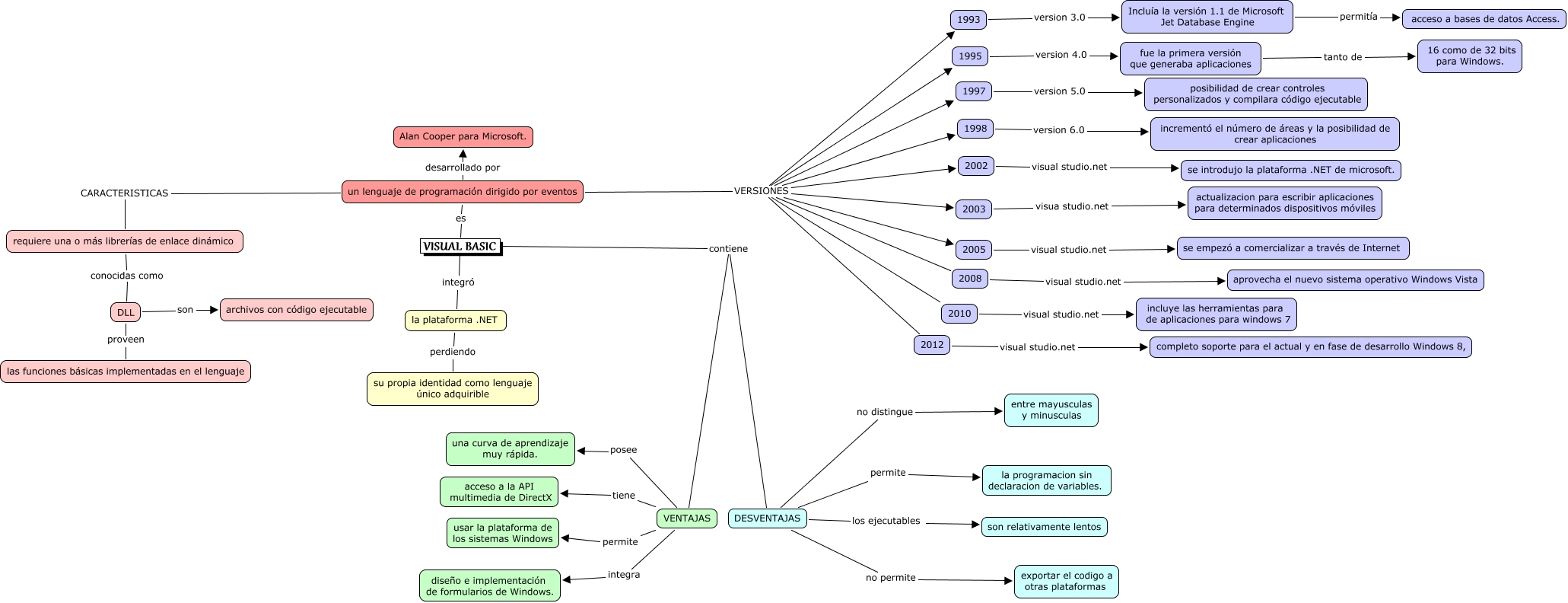 Este Cmap, tiene información relacionada con: SALA_1_PC25_visual b. map, 2012 visual studio.net completo soporte para el actual y en fase de desarrollo Windows 8,, VENTAJAS integra diseño e implementación de formularios de Windows., 2010 visual studio.net incluye las herramientas para de aplicaciones para windows 7, un lenguaje de programación dirigido por eventos VERSIONES 2010, un lenguaje de programación dirigido por eventos CARACTERISTICAS requiere una o más librerías de enlace dinámico, un lenguaje de programación dirigido por eventos VERSIONES 2008, VISUAL BASIC contiene VENTAJAS, 2003 visua studio.net actualizacion para escribir aplicaciones para determinados dispositivos móviles, un lenguaje de programación dirigido por eventos desarrollado por Alan Cooper para Microsoft., la plataforma .NET perdiendo su propia identidad como lenguaje único adquirible, 1993 version 3.0 Incluía la versión 1.1 de Microsoft Jet Database Engine, 2005 visual studio.net se empezó a comercializar a través de Internet, VISUAL BASIC contiene DESVENTAJAS, un lenguaje de programación dirigido por eventos VERSIONES 2005, DESVENTAJAS no permite exportar el codigo a otras plataformas, DLL son archivos con código ejecutable, 2002 visual studio.net se introdujo la plataforma .NET de microsoft., VENTAJAS permite usar la plataforma de los sistemas Windows, VENTAJAS posee una curva de aprendizaje muy rápida., DESVENTAJAS no distingue entre mayusculas y minusculas