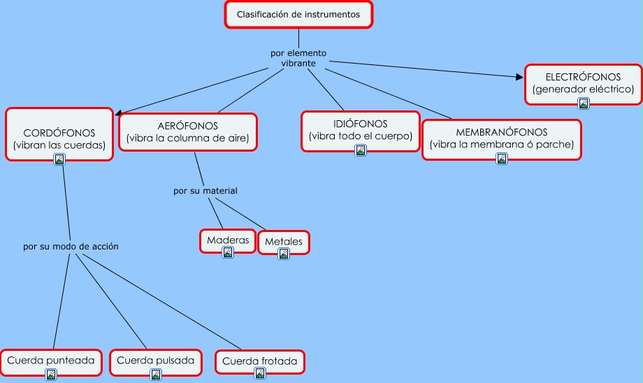 Este Cmap, tiene información relacionada con: Clasificación de instrumentos, Clasificación de instrumentos por elemento vibrante MEMBRANÓFONOS (vibra la membrana ó parche), CORDÓFONOS (vibran las cuerdas) por su modo de acción Cuerda frotada, AERÓFONOS (vibra la columna de aire) por su material Maderas, CORDÓFONOS (vibran las cuerdas) por su modo de acción Cuerda pulsada, AERÓFONOS (vibra la columna de aire) por su material Metales, Clasificación de instrumentos por elemento vibrante IDIÓFONOS (vibra todo el cuerpo), Clasificación de instrumentos por elemento vibrante AERÓFONOS (vibra la columna de aire), Clasificación de instrumentos por elemento vibrante ELECTRÓFONOS (generador eléctrico), CORDÓFONOS (vibran las cuerdas) por su modo de acción Cuerda punteada, Clasificación de instrumentos por elemento vibrante CORDÓFONOS (vibran las cuerdas)