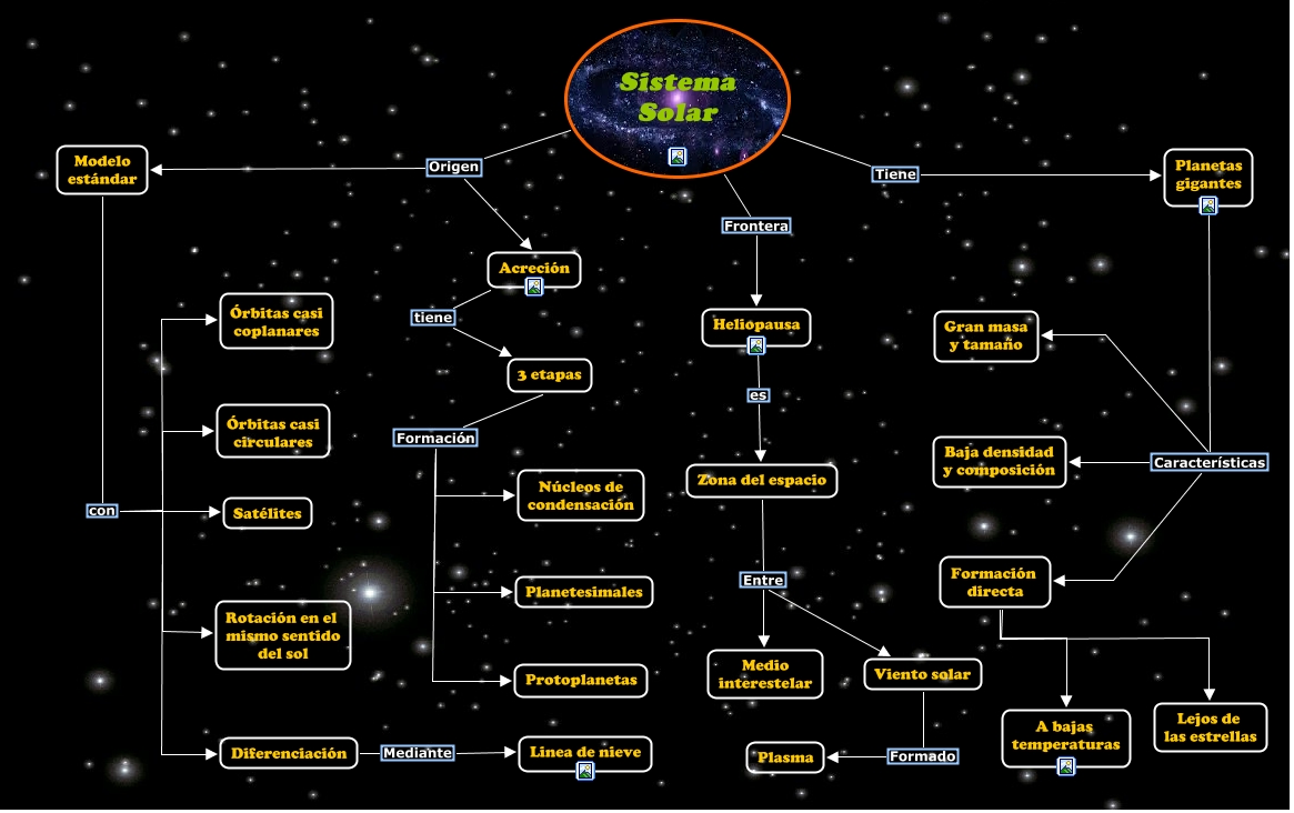 Este Cmap, tiene información relacionada con: Sist. Solar, Modelo estándar con Satélites, Sistema Solar Frontera Heliopausa, Planetas gigantes Características Baja densidad y composición, 3 etapas Formación Planetesimales, 3 etapas Formación Protoplanetas, Modelo estándar con Rotación en el mismo sentido del sol, Formación directa A bajas temperaturas, Acreción tiene 3 etapas, Planetas gigantes Características Gran masa y tamaño, Zona del espacio Entre Medio interestelar, Formación directa Lejos de las estrellas, Planetas gigantes Características Formación directa, Viento solar Formado Plasma, Diferenciación Mediante Linea de nieve, Modelo estándar con Diferenciación, Modelo estándar con Órbitas casi circulares, Heliopausa es Zona del espacio, Zona del espacio Entre Viento solar, 3 etapas Formación Núcleos de condensación, Sistema Solar Origen Modelo estándar