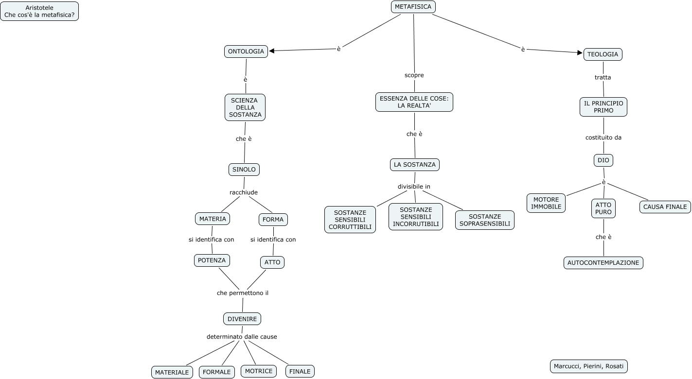 This Concept Map, created with IHMC CmapTools, has information related to: Metafisica, METAFISICA scopre ESSENZA DELLE COSE: LA REALTA', METAFISICA è ONTOLOGIA, ATTO che permettono il DIVENIRE, LA SOSTANZA divisibile in SOSTANZE SENSIBILI INCORRUTIBILI, SCIENZA DELLA SOSTANZA che è SINOLO, MATERIA si identifica con POTENZA, DIVENIRE determinato dalle cause MATERIALE, TEOLOGIA tratta IL PRINCIPIO PRIMO, FORMA si identifica con ATTO, DIVENIRE determinato dalle cause FINALE, ONTOLOGIA è SCIENZA DELLA SOSTANZA, LA SOSTANZA divisibile in SOSTANZE SENSIBILI CORRUTTIBILI, SINOLO racchiude MATERIA, DIO è MOTORE IMMOBILE, SINOLO racchiude FORMA, ATTO PURO che è AUTOCONTEMPLAZIONE, POTENZA che permettono il DIVENIRE, DIO è CAUSA FINALE, DIVENIRE determinato dalle cause FORMALE, DIVENIRE determinato dalle cause MOTRICE