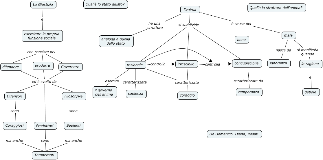 Questa Cmap, creata con IHMC CmapTools, contiene informazioni relative a: Platone_GIUSTIZIA_Diana, Rosati, De Domenicororretta, irrascibile controlla concupiscibile, razionale controlla irrascibile, esercitare la propria funzione sociale che consiste nel difendere, razionale esercita il governo dell'anima, Produttori sono Temperanti, Sapienti ma anche Temperanti, l'anima ha una struttura analoga a quella dello stato, produrre ed è svolto da Filosofi/Re, l'anima è causa del bene, esercitare la propria funzione sociale che consiste nel produrre, l'anima si suddivide irrascibile, Filosofi/Re sono Sapienti, esercitare la propria funzione sociale che consiste nel Governare, Difensori sono Coraggiosi, l'anima si suddivide razionale, produrre ed è svolto da Produttori, La Giustizia è esercitare la propria funzione sociale, razionale controlla concupiscibile, concupiscibile caratterizzata da temperanza, Governare ed è svolto da Filosofi/Re
