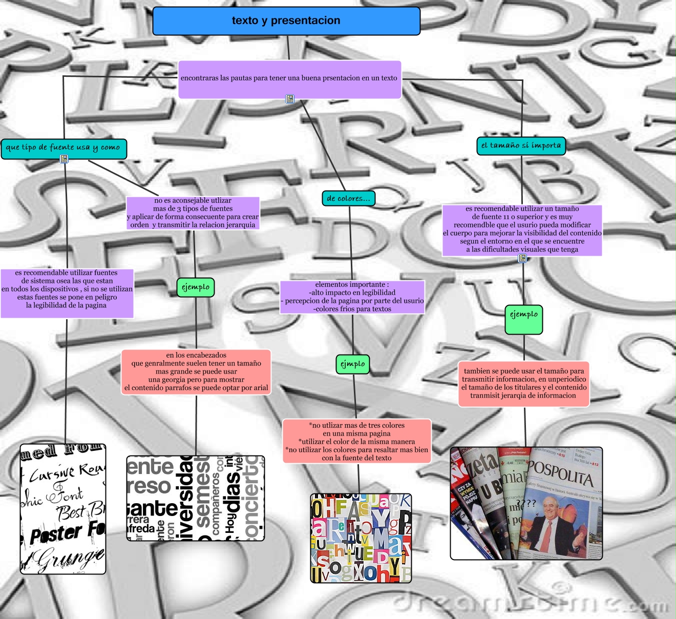 Este Cmap, tiene información relacionada con: castellano mapa, ejmplo *no utlizar mas de tres colores en una misma pagina *utilizar el color de la misma manera *no utilizar los colores para resaltar mas bien con la fuente del texto, que tipo de fuente usa y como es recomendable utilizar fuentes de sistema osea las que estan en todos los dispositivos , si no se utilizan estas fuentes se pone en peligro la legibilidad de la pagina ????, ejemplo en los encabezados que genralmente suelen tener un tamaño mas grande se puede usar una georgia pero para mostrar el contenido parrafos se puede optar por arial, el tamaño si importa es recomendable utilizar un tamaño de fuente 11 o superior y es muy recomendble que el usurio pueda modificar el cuerpo para mejorar la visibilidad del contenido segun el entorno en el que se encuentre a las dificultades visuales que tenga ejemplo, texto y presentacion encontraras las pautas para tener una buena prsentacion en un texto el tamaño si importa, que tipo de fuente usa y como no es aconsejable utlizar mas de 3 tipos de fuentes y aplicar de forma consecuente para crear orden y transmitir la relacion jerarquia ejemplo, de colores... elementos importante : -alto impacto en legibilidad - percepcion de la pagina por parte del usurio -colores frios para textos ejmplo, ejemplo tambien se puede usar el tamaño para transmitir informacion, en unperiodico el tamaño de los titulares y el contenido tranmisit jerarqia de informacion ????, texto y presentacion encontraras las pautas para tener una buena prsentacion en un texto de colores..., texto y presentacion encontraras las pautas para tener una buena prsentacion en un texto que tipo de fuente usa y como