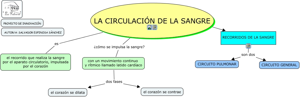 Este Cmap, tiene información relacionada con: LA CIRCULACIÓN DE LA SANGRE, LA CIRCULACIÓN DE LA SANGRE es el recorrido que realiza la sangre por el aparato circulatorio, impulsada por el corazón, con un movimiento continuo y rítmico llamado latido cardíaco dos fases el corazón se dilata, RECORRIDOS DE LA SANGRE son dos CIRCUITO PULMONAR, LA CIRCULACIÓN DE LA SANGRE ¿cómo se impulsa la sangre? con un movimiento continuo y rítmico llamado latido cardíaco, RECORRIDOS DE LA SANGRE son dos CIRCUITO GENERAL, LA CIRCULACIÓN DE LA SANGRE ???? RECORRIDOS DE LA SANGRE, con un movimiento continuo y rítmico llamado latido cardíaco dos fases el corazón se contrae