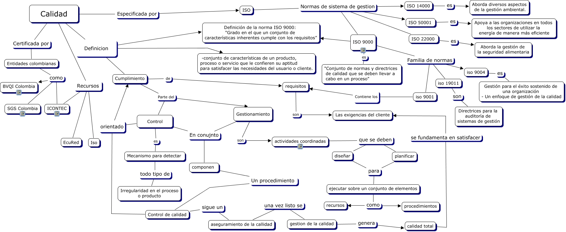 Este Cmap, tiene información relacionada con: Calidad2.cmap.cmap, iso 9001 Contiene los requisitos, diseñar para ejecutar sobre un conjunto de elementos, planificar para ejecutar sobre un conjunto de elementos, ISO 9000 Familia de normas iso 19011, Calidad Recursos ICONTEC, ISO 9000 es "Conjunto de normas y directrices de calidad que se deben llevar a cabo en un proceso", ISO 14000 es Aborda diversos aspectos de la gestión ambiental., Entidades colombianas como ICONTEC, requisitos son Las exigencias del cliente, Gestionamiento En conujnto componen, Calidad Definicion -conjunto de características de un producto, proceso o servicio que le confieren su aptitud para satisfacer las necesidades del usuario o cliente., ISO 9000 Familia de normas iso 9001, Calidad Recursos Iso, Control de calidad sigue un aseguramiento de la callidad, Entidades colombianas como SGS Colombia, ISO Normas de sistema de gestion ISO 9000, Calidad Certificada por Entidades colombianas, Calidad Definicion Cumplimiento, iso 19011 son Directrices para la auditoría de sistemas de gestión, Calidad Recursos EcuRed