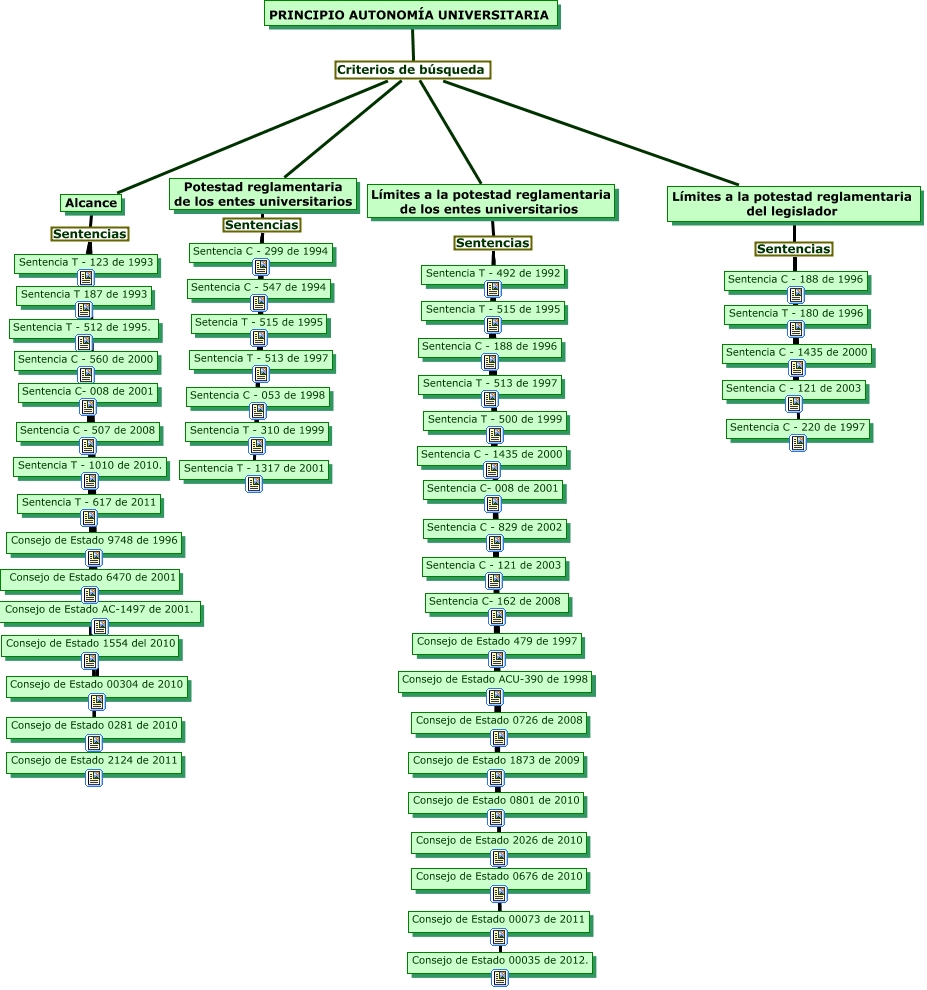 Este Cmap, tiene información relacionada con: Mapa conceptual autonomía universitaria, Límites a la potestad reglamentaria de los entes universitarios Sentencias Sentencia C - 829 de 2002, Límites a la potestad reglamentaria de los entes universitarios Sentencias Sentencia C - 1435 de 2000, Límites a la potestad reglamentaria de los entes universitarios Sentencias Sentencia C- 008 de 2001, Límites a la potestad reglamentaria de los entes universitarios Sentencias Consejo de Estado 0726 de 2008, Límites a la potestad reglamentaria de los entes universitarios Sentencias Consejo de Estado 0801 de 2010, Potestad reglamentaria de los entes universitarios Sentencias Sentencia C - 053 de 1998, Límites a la potestad reglamentaria de los entes universitarios Sentencias Consejo de Estado 2026 de 2010, PRINCIPIO AUTONOMÍA UNIVERSITARIA Criterios de búsqueda Potestad reglamentaria de los entes universitarios, Alcance Sentencias Sentencia T - 1010 de 2010., Alcance Sentencias Sentencia C- 008 de 2001, Alcance Sentencias Sentencia T 187 de 1993, Límites a la potestad reglamentaria del legislador Sentencias Sentencia C - 1435 de 2000, Límites a la potestad reglamentaria del legislador Sentencias Sentencia C - 188 de 1996, Límites a la potestad reglamentaria del legislador Sentencias Sentencia C - 121 de 2003, Límites a la potestad reglamentaria de los entes universitarios Sentencias Sentencia T - 500 de 1999, Potestad reglamentaria de los entes universitarios Sentencias Sentencia T - 513 de 1997, Potestad reglamentaria de los entes universitarios Sentencias Sentencia C - 299 de 1994, Alcance Sentencias Consejo de Estado 2124 de 2011, Alcance Sentencias Sentencia C - 560 de 2000, Límites a la potestad reglamentaria del legislador Sentencias Sentencia C - 220 de 1997