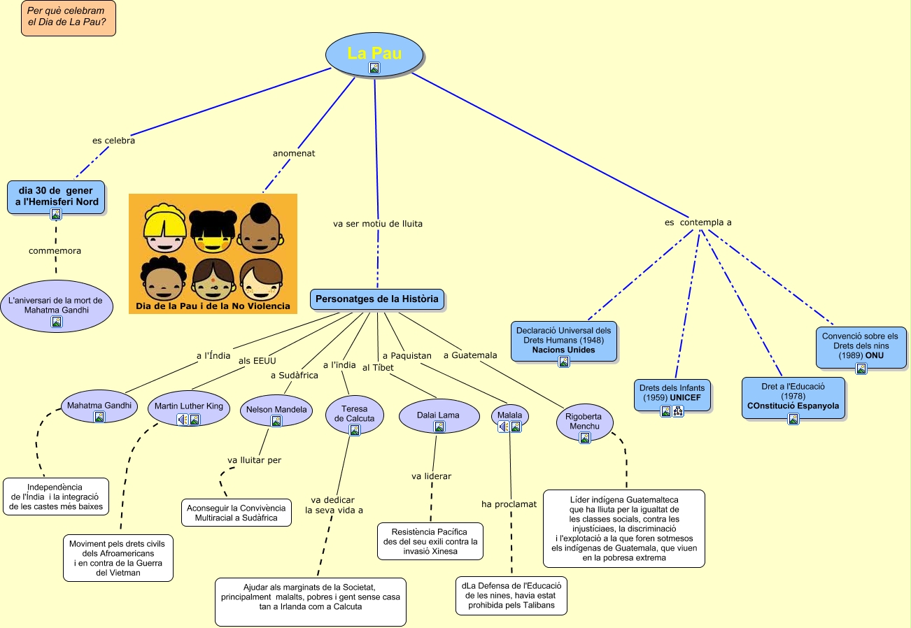 Este Cmap, tiene información relacionada con: La Pau activitat 2 revisat amb recursos, Dalai Lama va liderar Resistència Pacífica des del seu exili contra la invasió Xinesa, La Pau es contempla a Declaració Universal dels Drets Humans (1948) Nacions Unides, Rigoberta Menchu ???? Líder indígena Guatemalteca que ha lliuta per la igualtat de les classes socials, contra les injustíciaes, la discriminació i l'explotació a la que foren sotmesos els indígenas de Guatemala, que viuen en la pobresa extrema, Personatges de la Història a l'ïndia Teresa de Calcuta, Teresa de Calcuta va dedicar la seva vida a Ajudar als marginats de la Societat, principalment malalts, pobres i gent sense casa tan a Irlanda com a Calcuta, Dret a l'Educació (1978) COnstitució Espanyola es contempla a Declaració Universal dels Drets Humans (1948) Nacions Unides, Dret a l'Educació (1978) COnstitució Espanyola es contempla a Convenció sobre els Drets dels nins (1989) ONU, Malala ha proclamat dLa Defensa de l'Educació de les nines, havia estat prohibida pels Talibans, Drets dels Infants (1959) UNICEF es contempla a Convenció sobre els Drets dels nins (1989) ONU, dia 30 de gener a l'Hemisferi Nord commemora L'aniversari de la mort de Mahatma Gandhi, Mahatma Gandhi ???? Independència de l'Índia i la integració de les castes més baixes, Personatges de la Història a Paquistan Malala, Personatges de la Història als EEUU Martin Luther King, La Pau es contempla a Convenció sobre els Drets dels nins (1989) ONU, La Pau va ser motiu de lluita Personatges de la Història, Nelson Mandela va lluitar per Aconseguir la Convivència Multiracial a Sudàfrica, Personatges de la Història a Sudàfrica Nelson Mandela, Martin Luther King ???? Moviment pels drets civils dels Afroamericans i en contra de la Guerra del Vietman, La Pau anomenat Dia de la Pau i de la No Violencia, Drets dels Infants (1959) UNICEF es contempla a Declaració Universal dels Drets Humans (1948) Nacions Unides