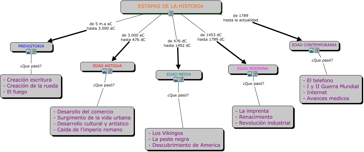 Este Cmap, tiene información relacionada con: ETAPAS DE LA HISTORIA, PREHISTORIA ¿Que pasó? - Creación escritura - Creación de la rueda - El fuego, EDAD ANTIGUA ¿Que pasó? - Desarollo del comercio - Surgimento de la vida urbana - Desarrollo cultural y artistico - Caida de l'imperio romano, ESTAPAS DE LA HISTORIA de 1789 hasta la actualidad EDAD CONTEMPORANIA, ESTAPAS DE LA HISTORIA de 5 m.a aC hasta 3.000 aC PREHISTORIA, ESTAPAS DE LA HISTORIA de 1453 dC hasta 1789 dC EDAD MODERNA, ESTAPAS DE LA HISTORIA de 3.000 aC hasta 476 dC EDAD ANTIGUA, ESTAPAS DE LA HISTORIA de 476 dC hasta 1492 dC EDAD MEDIA, EDAD CONTEMPORANIA ¿Que pasó? - El telefono - I y II Guerra Mundial - Internet - Avances medicos, EDAD MEDIA ¿Que pasó? - Los Vikingos - La peste negra - Descubrimiento de America, EDAD MODERNA ¿Que pasó? - La imprenta - Renacimiento - Revolución industrial