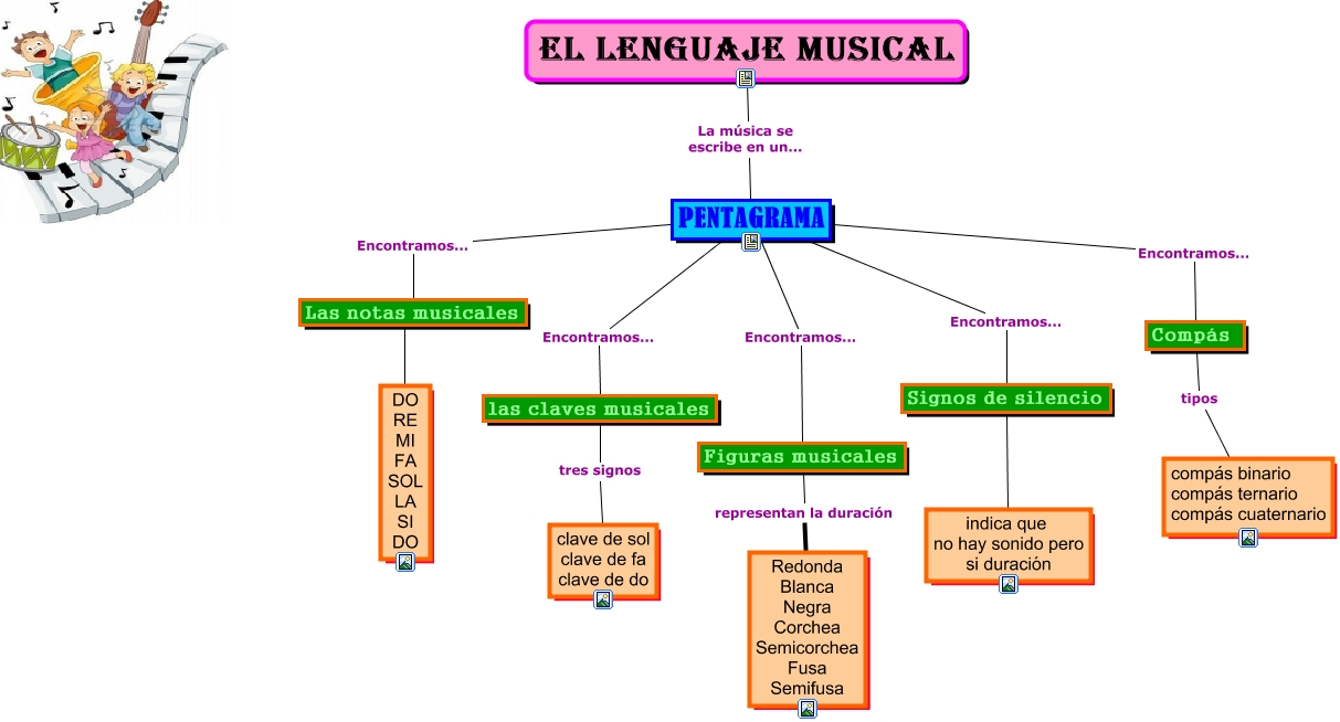 Este Cmap, tiene información relacionada con: el lenguaje musical, Las notas musicales ???? DO RE MI FA SOL LA SI DO, indica que no hay sonido pero si duración ???? Signos de silencio, PENTAGRAMA Encontramos... Signos de silencio, las claves musicales tres signos clave de sol clave de fa clave de do, Figuras musicales representan la duración Redonda Blanca Negra Corchea Semicorchea Fusa Semifusa, EL LENGUAJE MUSICAL La música se escribe en un... PENTAGRAMA, Compás tipos compás binario compás ternario compás cuaternario, PENTAGRAMA Encontramos... Las notas musicales, PENTAGRAMA Encontramos... Compás, PENTAGRAMA Encontramos... las claves musicales, PENTAGRAMA Encontramos... Figuras musicales