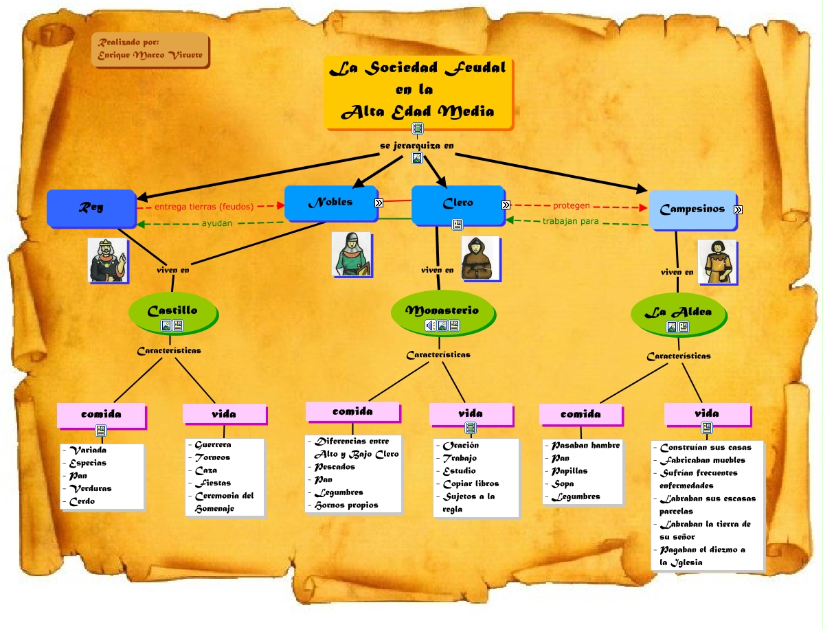 Este Cmap, tiene información relacionada con: La sociedad feudal en la Edad Media, La Aldea Características vida, La Sociedad Feudal en la Alta Edad Media se jerarquiza en Condes, Monasterio Características comida, comida Características vida, La Sociedad Feudal en la Alta Edad Media se jerarquiza en Monjas, La Sociedad Feudal en la Alta Edad Media se jerarquiza en Caballeros, comida - Variada - Especias - Pan - Verduras - Cerdo, La Sociedad Feudal en la Alta Edad Media se jerarquiza en Campesinos, Obispos se jerarquiza en Frailes, vida - Guerrera - Torneos - Caza - Fiestas - Ceremonia del Homenaje, Obispos se jerarquiza en Monjas, comida Características vida, Duques se jerarquiza en Rey, comida - Diferencias entre Alto y Bajo Clero - Pescados - Pan - Legumbres - Hornos propios, La Sociedad Feudal en la Alta Edad Media se jerarquiza en Marqueses, Duques se jerarquiza en Campesinos, La Sociedad Feudal en la Alta Edad Media se jerarquiza en Frailes, Nobles viven en Castillo, Duques se jerarquiza en Frailes, comida - Pasaban hambre - Pan - Papillas - Sopa - Legumbres