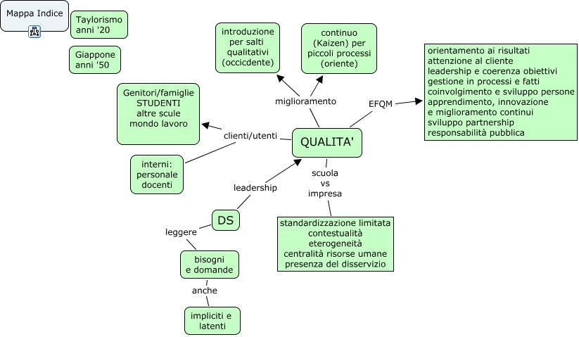 Questa Cmap, creata con IHMC CmapTools, contiene informazioni relative a: Qualità, QUALITA' clienti/utenti Genitori/famiglie STUDENTI altre scule mondo lavoro, QUALITA' miglioramento introduzione per salti qualitativi (occicdente), bisogni e domande anche impliciti e latenti, QUALITA' EFQM orientamento ai risultati attenzione al cliente leadership e coerenza obiettivi gestione in processi e fatti coinvolgimento e sviluppo persone apprendimento, innovazione e miglioramento continui sviluppo partnership responsabilità pubblica, QUALITA' clienti/utenti interni: personale docenti, QUALITA' miglioramento continuo (Kaizen) per piccoli processi (oriente), DS leggere bisogni e domande, DS leadership QUALITA', QUALITA' scuola vs impresa standardizzazione limitata contestualità eterogeneità centralità risorse umane presenza del disservizio