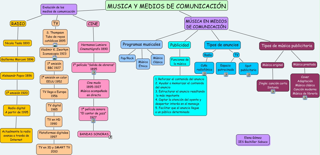 Este Cmap, tiene información relacionada con: Musica y medios de comunicación, MUSICA Y MEDIOS DE COMUNICACIÓN MÚSICA EN MEDIOS DE COMUNICACIÓN Programas musicales, S. Thompson Tubo de rayos catódicos 1895 Vladimir K. Zworkyn Iconoscopio 1923 1ª emisión BBC 1927, TV en HD 1990 Plataformas digitales 1997 TV en 3D y SMART TV 2010, Evolución de los medios de comunicación RADIO Nicola Tesla 1893, MUSICA Y MEDIOS DE COMUNICACIÓN MÚSICA EN MEDIOS DE COMUNICACIÓN Tipos de música publicitaria, Programas musicales ???? Música Étnica, Tipos de anuncios TV Spot publicitario, Tipos de música publicitaria Música prestada Cover Adaptación Música clásica Canción moderna Música de librería, Tipos de música publicitaria Música original Jingle: canción corta Sintonía, Cine mudo 1895-1927 Música acompañada en directo 1ª película sonora "El cantor de jazz" 1927 Bandas sonoras, Programas musicales ???? Pop/Rock, Tipos de anuncios Radio Cuña radiofónica, TV llega a Europa 1956 TV digital 1985 TV en HD 1990, Aleksandr Popov 1896 1ª emisión 1920 Radio digital A partir de 1995, MUSICA Y MEDIOS DE COMUNICACIÓN MÚSICA EN MEDIOS DE COMUNICACIÓN Publicidad, Evolución de los medios de comunicación TV S. Thompson Tubo de rayos catódicos 1895, Programas musicales ???? Música Clásica, MUSICA Y MEDIOS DE COMUNICACIÓN MÚSICA EN MEDIOS DE COMUNICACIÓN Tipos de anuncios, Radio digital A partir de 1995 ???? Actualmente la radio avanza a través de Internet, Tipos de anuncios TV Espacio patrocinado