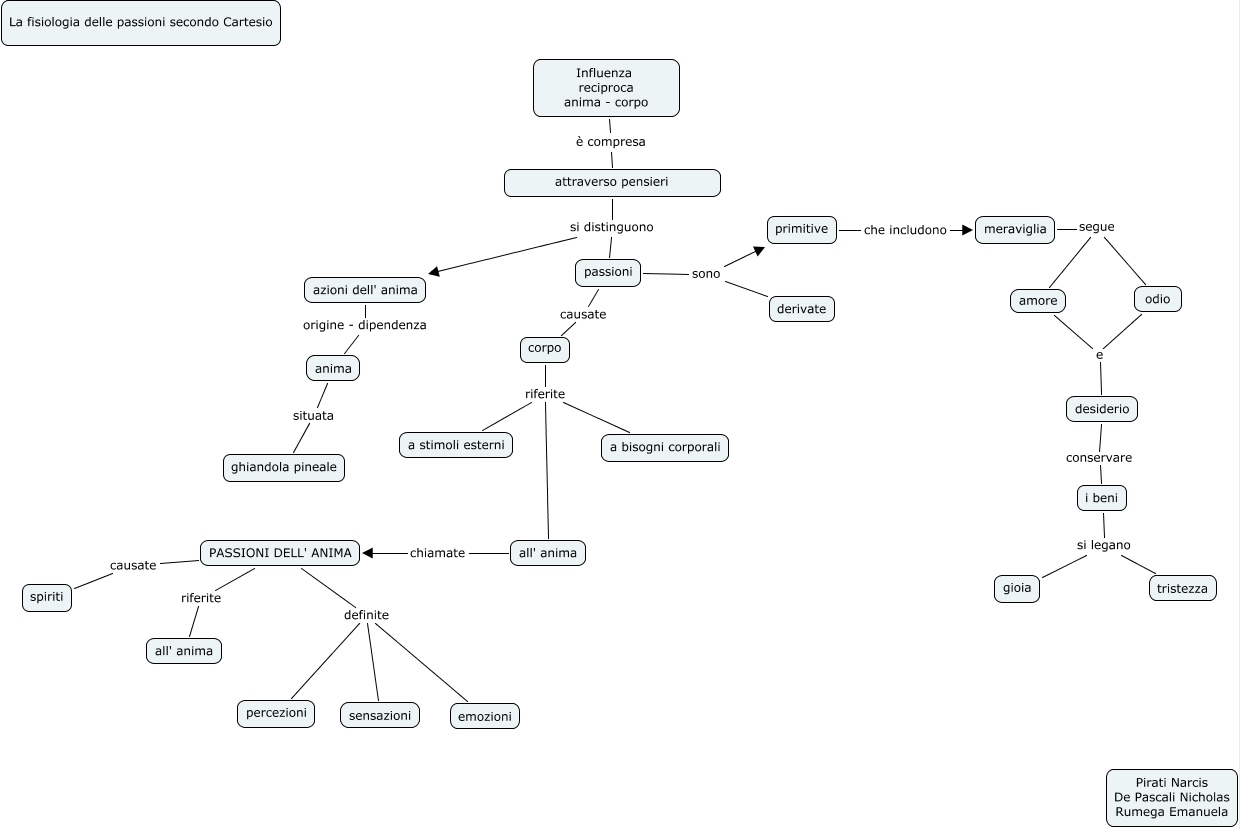 Questa Cmap, creata con IHMC CmapTools, contiene informazioni relative a: La fisiologia delle passioni (Cartesio), azioni dell' anima origine - dipendenza anima, i beni si legano gioia, all' anima chiamate PASSIONI DELL' ANIMA, PASSIONI DELL' ANIMA definite emozioni, desiderio conservare i beni, amore e desiderio, corpo riferite all' anima, odio e desiderio, passioni causate corpo, passioni sono primitive, passioni sono derivate, corpo riferite a bisogni corporali, PASSIONI DELL' ANIMA causate spiriti, primitive che includono meraviglia, Influenza reciproca anima - corpo è compresa attraverso pensieri, attraverso pensieri si distinguono passioni, corpo riferite a stimoli esterni, PASSIONI DELL' ANIMA definite percezioni, i beni si legano tristezza, anima situata ghiandola pineale