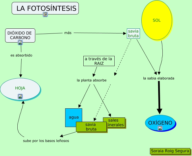 Aquest mapa conceptual conté informació relacionada amb: LA FOTOSÍNTESIS, SOL la sabia elaborada OXÍGENO, savia bruta la sabia elaborada OXÍGENO, savia bruta sube por los basos leñosos HOJA, a través de la RAIZ la planta absorbe agua, DIÓXIDO DE CARBONO más savia bruta, DIÓXIDO DE CARBONO es absorbido HOJA, savia bruta savia bruta, a través de la RAIZ la planta absorbe sales minerales