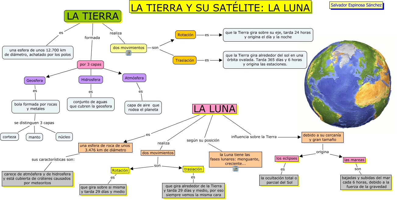 Este Cmap, tiene información relacionada con: LA TIERRA Y SU SATÉLITE- LA LUNA, bola formada por rocas y metales se distinguen 3 capas núcleo, LA LUNA es una esfera de roca de unos 3.476 km de diámetro, bola formada por rocas y metales se distinguen 3 capas manto, Geosfera es bola formada por rocas y metales, dos movimientos son Rotación, Rotación es que gira sobre si misma y tarda 29 días y medio, una esfera de roca de unos 3.476 km de diámetro sus características son: carece de atmósfera y de hidrosfera y está cubierta de cráteres causados por meteoritos, Rotación es que la Tierra gira sobre su eje, tarda 24 horas y origina el día y la noche, por 3 capas ???? Atmósfera, traslación es que gira alrededor de la Tierra y tarda 29 días y medio, por eso siempre vemos la misma cara, las mareas son bajadas y subidas del mar cada 6 horas, debido a la fuerza de la gravedad, debido a su cercanía y gran tamaño origina las mareas, LA TIERRA formada por 3 capas, dos movimientos son Rotación, Atmósfera es capa de aire que rodea el planeta, LA TIERRA es una esfera de unos 12.700 km de diámetro, achatado por los polos, bola formada por rocas y metales se distinguen 3 capas corteza, LA LUNA influencia sobre la Tierra debido a su cercanía y gran tamaño, Hidrosfera es conjunto de aguas que cubren la geosfera, dos movimientos son Traslación