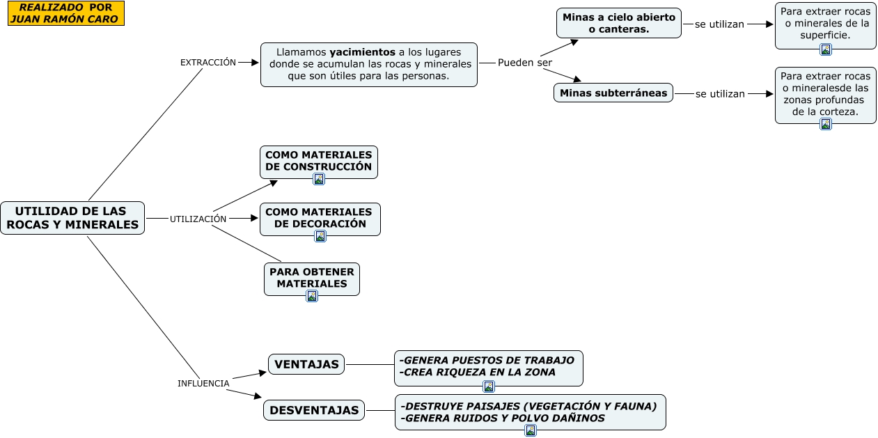 Este Cmap, tiene información relacionada con: Utilidades de las rocas y minerales, Llamamos yacimientos a los lugares donde se acumulan las rocas y minerales que son útiles para las personas. Pueden ser Minas subterráneas, VENTAJAS ???? -GENERA PUESTOS DE TRABAJO -CREA RIQUEZA EN LA ZONA, UTILIDAD DE LAS ROCAS Y MINERALES INFLUENCIA DESVENTAJAS, UTILIDAD DE LAS ROCAS Y MINERALES EXTRACCIÓN Llamamos yacimientos a los lugares donde se acumulan las rocas y minerales que son útiles para las personas., UTILIDAD DE LAS ROCAS Y MINERALES UTILIZACIÓN COMO MATERIALES DE DECORACIÓN, Minas subterráneas se utilizan Para extraer rocas o mineralesde las zonas profundas de la corteza., UTILIDAD DE LAS ROCAS Y MINERALES INFLUENCIA VENTAJAS, DESVENTAJAS ???? -DESTRUYE PAISAJES (VEGETACIÓN Y FAUNA) -GENERA RUIDOS Y POLVO DAÑINOS, Minas a cielo abierto o canteras. se utilizan Para extraer rocas o minerales de la superficie., Llamamos yacimientos a los lugares donde se acumulan las rocas y minerales que son útiles para las personas. Pueden ser Minas a cielo abierto o canteras., UTILIDAD DE LAS ROCAS Y MINERALES UTILIZACIÓN COMO MATERIALES DE CONSTRUCCIÓN, UTILIDAD DE LAS ROCAS Y MINERALES UTILIZACIÓN PARA OBTENER MATERIALES