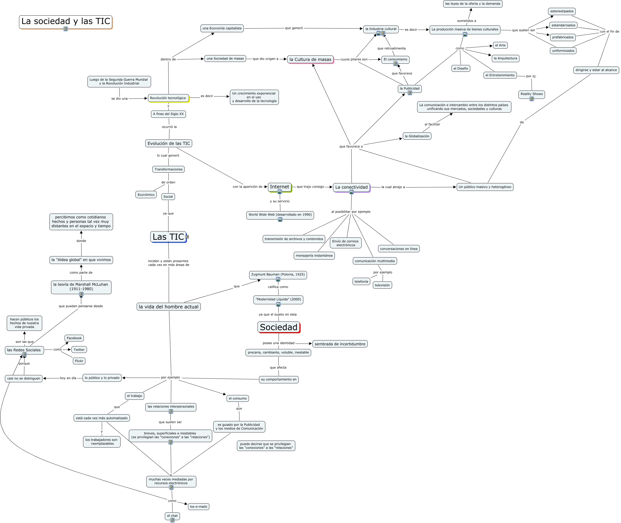 Este Cmap, tiene información relacionada con: DTM, La conectividad al posibilitar por ejemplo mensajería instantánea, Sociedad posee una identidad sembrada de incertidumbre, lo público y lo privado hoy en día casi no se distinguen, A fines del Siglo XX ocurrió la Evolución de las TIC, muchas veces mediadas por recursos electrónicos como el chat, Un público masivo y heterogéneo que favorece a la Publicidad, las relaciones interpersonales que suelen ser breves, superficiales e inestables (se privilegian las "conexiones" a las "relaciones"), Luego de la Segunda Guerra Mundial y la Revolución Industrial se dio una Revolución tecnológica, La conectividad al posibilitar por ejemplo conversaciones en línea, el consumo que es guiado por la Publicidad y los medios de Comunicación, La conectividad que favorece a la Globalización, la Industria cultural es decir La producción masiva de bienes culturales, la vida del hombre actual que Zygmunt Bauman (Polonia, 1925), Transformaciones de orden Social, comunicación multimedia por ejemplo televisión, Revolución tecnológica y A fines del Siglo XX, Un público masivo y heterogéneo que favorece a la Cultura de masas, Un público masivo y heterogéneo que favorece a la Globalización, su comportamiento en por ejemplo las relaciones interpersonales, prefabricados con el fin de dirigirse y estar al alcance