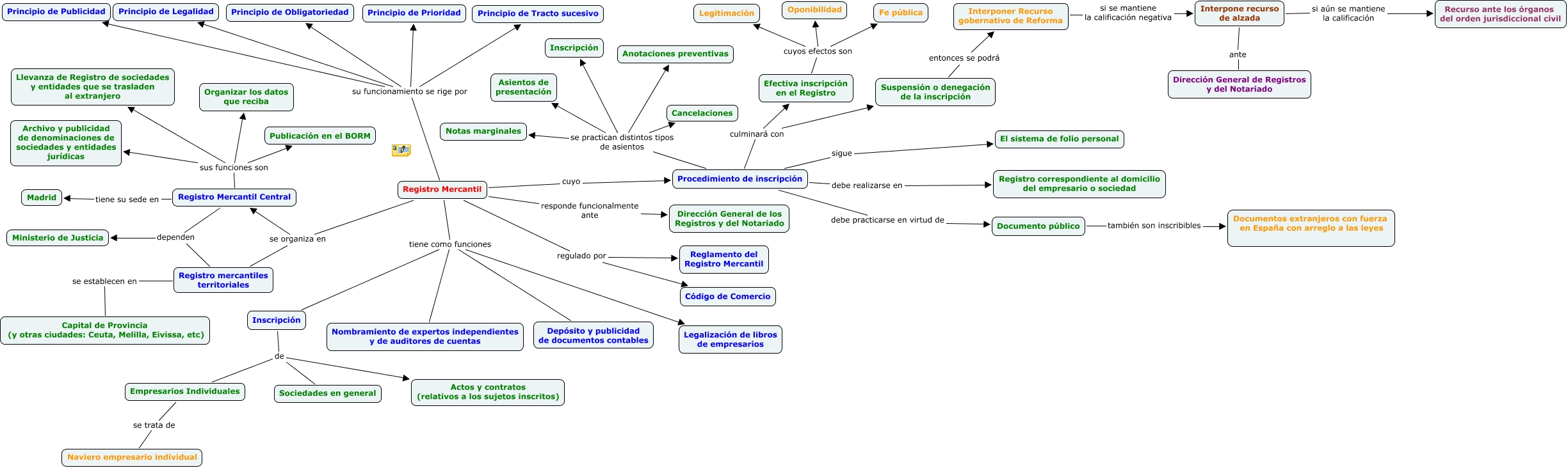 Este Cmap, tiene información relacionada con: Mapa conceptual- Registro mercantil, Registro Mercantil Central sus funciones son Archivo y publicidad de denominaciones de sociedades y entidades jurídicas, Registro Mercantil Central tiene su sede en Madrid, Procedimiento de inscripción debe realizarse en Registro correspondiente al domicilio del empresario o sociedad, Efectiva inscripción en el Registro cuyos efectos son Legitimación, Registro Mercantil su funcionamiento se rige por Principio de Tracto sucesivo, Registro Mercantil se organiza en Registro mercantiles territoriales, Registro Mercantil Central sus funciones son Organizar los datos que reciba, Efectiva inscripción en el Registro cuyos efectos son Fe pública, Registro Mercantil Central dependen Ministerio de Justicia, Procedimiento de inscripción se practican distintos tipos de asientos Cancelaciones, Interponer Recurso gobernativo de Reforma si se mantiene la calificación negativa Interpone recurso de alzada, Interpone recurso de alzada ante Dirección General de Registros y del Notariado, Inscripción de Sociedades en general, Procedimiento de inscripción se practican distintos tipos de asientos Inscripción, Procedimiento de inscripción culminará con Efectiva inscripción en el Registro, Registro Mercantil regulado por Código de Comercio, Efectiva inscripción en el Registro cuyos efectos son Oponibilidad, Inscripción de Actos y contratos (relativos a los sujetos inscritos), Registro Mercantil su funcionamiento se rige por Principio de Publicidad, Procedimiento de inscripción se practican distintos tipos de asientos Asientos de presentación