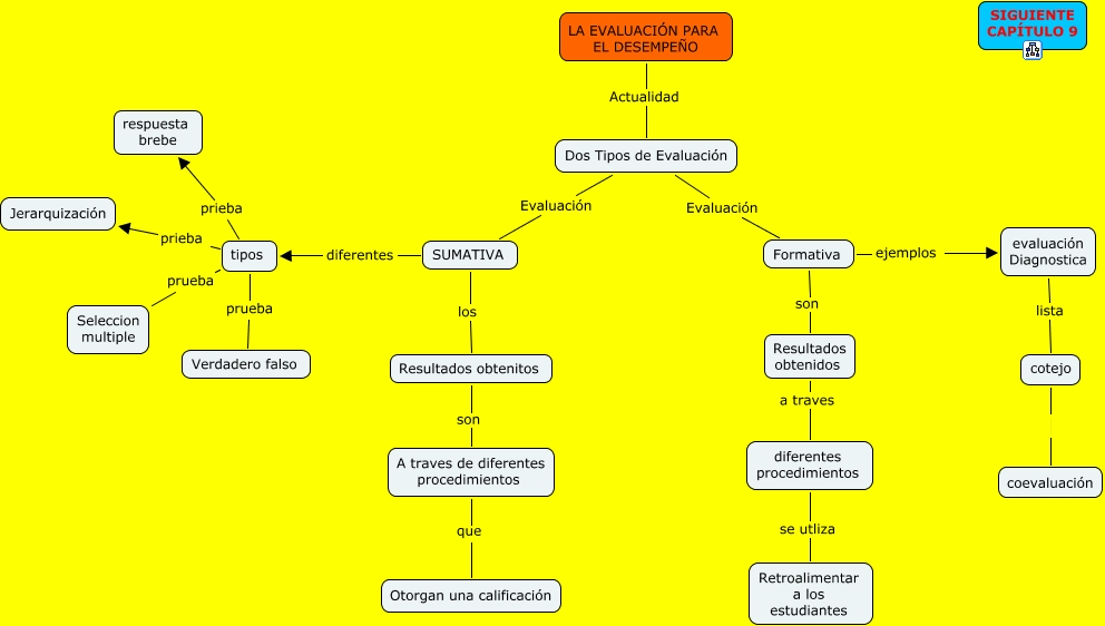 Este Cmap, tiene información relacionada con: Capítulo 8, tipos prueba Verdadero falso, tipos prueba Seleccion multiple, diferentes procedimientos se utliza Retroalimentar a los estudiantes, Resultados obtenitos son A traves de diferentes procedimientos, Dos Tipos de Evaluación Evaluación Formativa, Formativa ejemplos evaluación Diagnostica, evaluación Diagnostica lista cotejo, Resultados obtenidos a traves diferentes procedimientos, cotejo coevaluación, tipos prieba respuesta brebe, LA EVALUACIÓN PARA EL DESEMPEÑO Actualidad Dos Tipos de Evaluación, SUMATIVA los Resultados obtenitos, Formativa son Resultados obtenidos, Dos Tipos de Evaluación Evaluación SUMATIVA, A traves de diferentes procedimientos que Otorgan una calificación, SUMATIVA diferentes tipos, tipos prieba Jerarquización