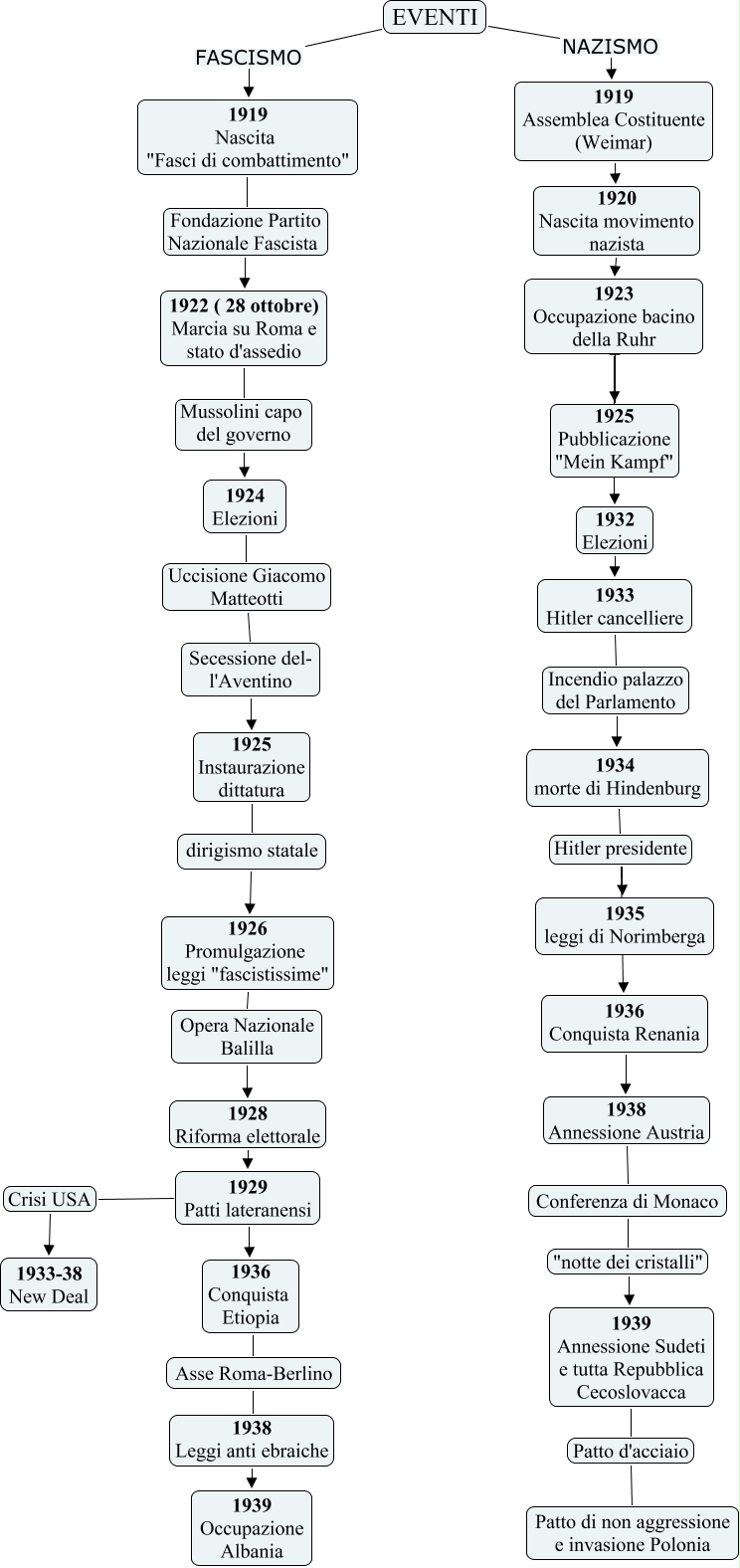 Questa Cmap, creata con IHMC CmapTools, contiene informazioni relative a: fascismo e nazismo, 1929 Patti lateranensi Crisi USA 1933-38 New Deal, 1923 Occupazione bacino della Ruhr 1925 Pubblicazione "Mein Kampf", dirigismo statale 1926 Promulgazione leggi "fascistissime" Opera Nazionale Balilla, 1936 Conquista Renania 1938 Annessione Austria Conferenza di Monaco, 1929 Patti lateranensi 1936 Conquista Etiopia Asse Roma-Berlino, 1924 Elezioni Uccisione Giacomo Matteotti Secessione del- l'Aventino, 1934 morte di Hindenburg Hitler presidente 1936 Conquista Renania, 1919 Nascita "Fasci di combattimento" Fondazione Partito Nazionale Fascista 1922 ( 28 ottobre) Marcia su Roma e stato d'assedio, 1919 Assemblea Costituente (Weimar) 1920 Nascita movimento nazista 1923 Occupazione bacino della Ruhr, Opera Nazionale Balilla 1928 Riforma elettorale 1929 Patti lateranensi, 1939 Annessione Sudeti e tutta Repubblica Cecoslovacca Patto d'acciaio Patto di non aggressione e invasione Polonia, EVENTI FASCISMO 1919 Nascita "Fasci di combattimento", 1934 morte di Hindenburg Hitler presidente 1935 leggi di Norimberga, 1933 Hitler cancelliere Incendio palazzo del Parlamento 1934 morte di Hindenburg, Conferenza di Monaco "notte dei cristalli" 1939 Annessione Sudeti e tutta Repubblica Cecoslovacca, Secessione del- l'Aventino 1925 Instaurazione dittatura dirigismo statale, Asse Roma-Berlino 1938 Leggi anti ebraiche 1939 Occupazione Albania, EVENTI NAZISMO 1919 Assemblea Costituente (Weimar), 1922 ( 28 ottobre) Marcia su Roma e stato d'assedio Mussolini capo del governo 1924 Elezioni, 1923 Occupazione bacino della Ruhr 1932 Elezioni 1933 Hitler cancelliere