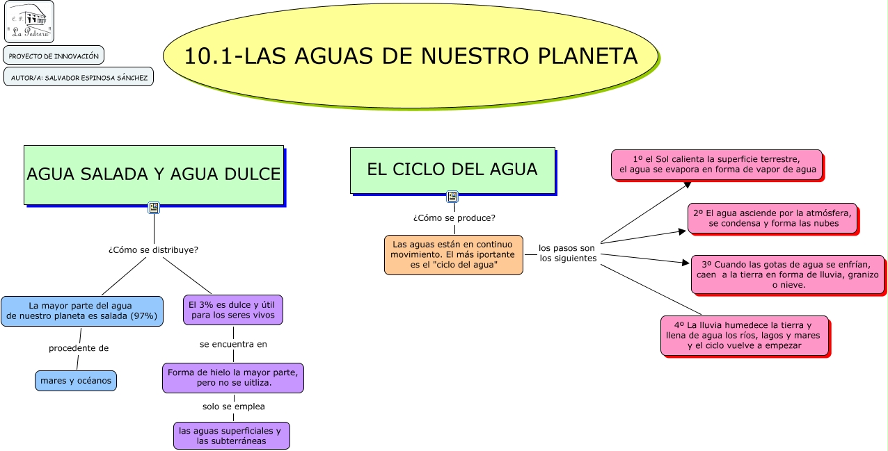 Este Cmap, tiene información relacionada con: 10.1- LAS AGUAS DE NUESTRO PLANETA, La mayor parte del agua de nuestro planeta es salada (97%) procedente de mares y océanos, Forma de hielo la mayor parte, pero no se uitliza. solo se emplea las aguas superficiales y las subterráneas, AGUA SALADA Y AGUA DULCE ¿Cómo se distribuye? La mayor parte del agua de nuestro planeta es salada (97%), Las aguas están en continuo movimiento. El más iportante es el "ciclo del agua" los pasos son los siguientes 2º El agua asciende por la atmósfera, se condensa y forma las nubes, Las aguas están en continuo movimiento. El más iportante es el "ciclo del agua" los pasos son los siguientes 4º La lluvia humedece la tierra y llena de agua los ríos, lagos y mares y el ciclo vuelve a empezar, Las aguas están en continuo movimiento. El más iportante es el "ciclo del agua" los pasos son los siguientes 1º el Sol calienta la superficie terrestre, el agua se evapora en forma de vapor de agua, AGUA SALADA Y AGUA DULCE ¿Cómo se distribuye? El 3% es dulce y útil para los seres vivos, Las aguas están en continuo movimiento. El más iportante es el "ciclo del agua" los pasos son los siguientes 3º Cuando las gotas de agua se enfrían, caen a la tierra en forma de lluvia, granizo o nieve., EL CICLO DEL AGUA ¿Cómo se produce? Las aguas están en continuo movimiento. El más iportante es el "ciclo del agua", El 3% es dulce y útil para los seres vivos se encuentra en Forma de hielo la mayor parte, pero no se uitliza.