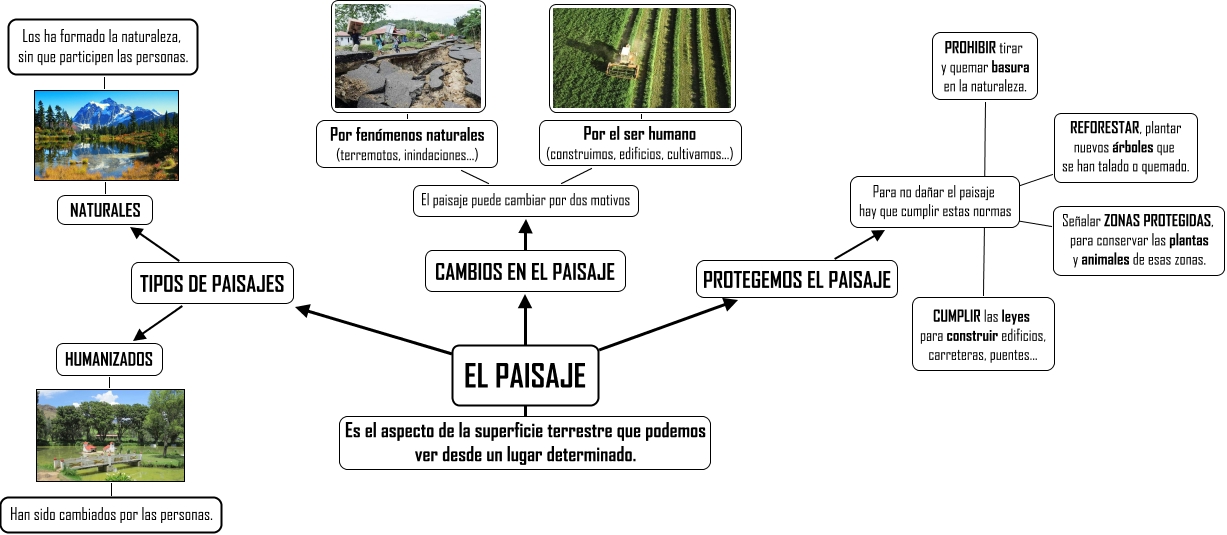 Este Cmap, tiene información relacionada con: ELEMENTOS DEL PAISAJE BLANCO, EL PAISAJE PROTEGEMOS EL PAISAJE Para no dañar el paisaje hay que cumplir estas normas, EL PAISAJE TIPOS DE PAISAJES NATURALES, Para no dañar el paisaje hay que cumplir estas normas ???? Señalar ZONAS PROTEGIDAS, para conservar las plantas y animales de esas zonas., EL PAISAJE Es el aspecto de la superficie terrestre que podemos ver desde un lugar determinado. Es el aspecto de la superficie terrestre que podemos ver desde un lugar determinado., HUMANIZADOS Han sido cambiados por las personas., El paisaje puede cambiar por dos motivos Por fenómenos naturales (terremotos, inindaciones...), Para no dañar el paisaje hay que cumplir estas normas ???? PROHIBIR tirar y quemar basura en la naturaleza., El paisaje puede cambiar por dos motivos Por el ser humano (construimos, edificios, cultivamos...), Para no dañar el paisaje hay que cumplir estas normas ???? CUMPLIR las leyes para construir edificios, carreteras, puentes..., EL PAISAJE TIPOS DE PAISAJES HUMANIZADOS, EL PAISAJE CAMBIOS EN EL PAISAJE El paisaje puede cambiar por dos motivos, Para no dañar el paisaje hay que cumplir estas normas ???? REFORESTAR, plantar nuevos árboles que se han talado o quemado., NATURALES Los ha formado la naturaleza, sin que participen las personas.