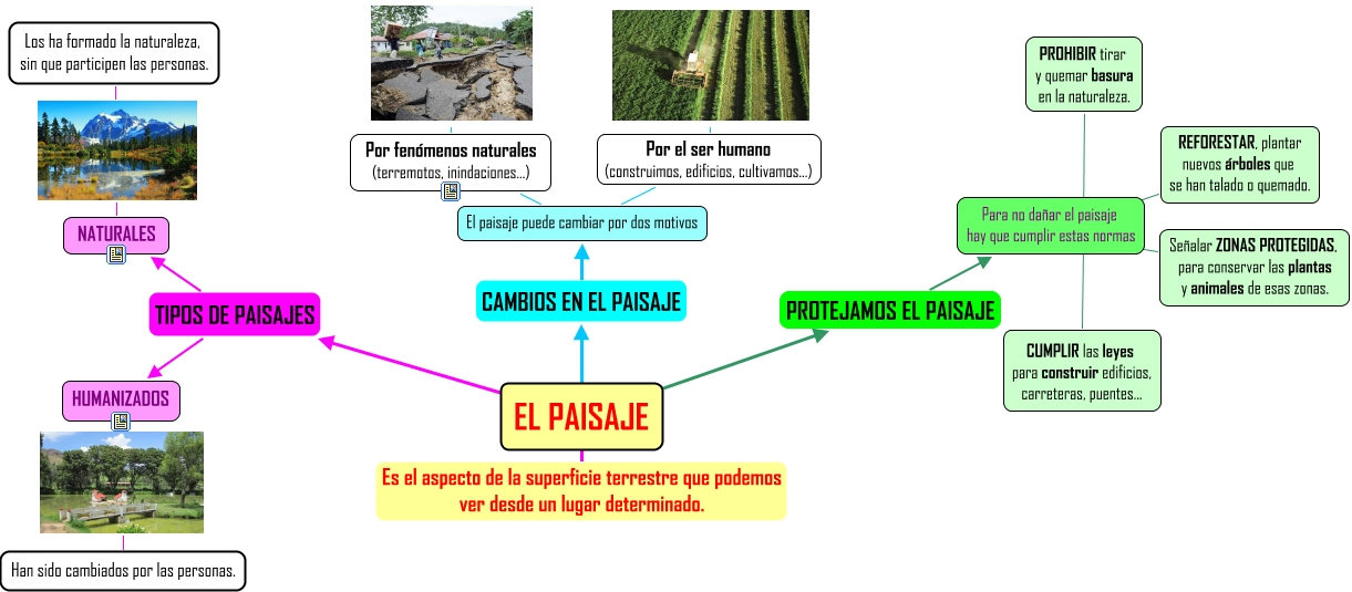 Este Cmap, tiene información relacionada con: ELEMENTOS DEL PAISAJE, El paisaje puede cambiar por dos motivos Por fenómenos naturales (terremotos, inindaciones...), EL PAISAJE PROTEJAMOS EL PAISAJE Para no dañar el paisaje hay que cumplir estas normas, Para no dañar el paisaje hay que cumplir estas normas ???? PROHIBIR tirar y quemar basura en la naturaleza., Para no dañar el paisaje hay que cumplir estas normas ???? REFORESTAR, plantar nuevos árboles que se han talado o quemado., NATURALES Los ha formado la naturaleza, sin que participen las personas., EL PAISAJE CAMBIOS EN EL PAISAJE El paisaje puede cambiar por dos motivos, Para no dañar el paisaje hay que cumplir estas normas ???? Señalar ZONAS PROTEGIDAS, para conservar las plantas y animales de esas zonas., El paisaje puede cambiar por dos motivos Por el ser humano (construimos, edificios, cultivamos...), EL PAISAJE TIPOS DE PAISAJES NATURALES, Para no dañar el paisaje hay que cumplir estas normas ???? CUMPLIR las leyes para construir edificios, carreteras, puentes..., HUMANIZADOS Han sido cambiados por las personas., EL PAISAJE Es el aspecto de la superficie terrestre que podemos ver desde un lugar determinado. Es el aspecto de la superficie terrestre que podemos ver desde un lugar determinado., EL PAISAJE TIPOS DE PAISAJES HUMANIZADOS