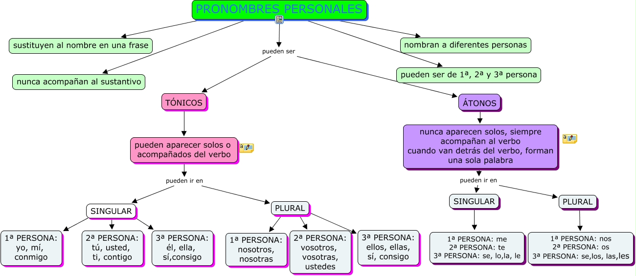 Este Cmap, tiene información relacionada con: TEMA7 PRONOMBRES PERSONALES, PLURAL ???? 3ª PERSONA: ellos, ellas, sí, consigo, SINGULAR ???? 3ª PERSONA: él, ella, sí,consigo, PRONOMBRES PERSONALES ???? nunca acompañan al sustantivo, SINGULAR ???? 1ª PERSONA: me 2ª PERSONA: te 3ª PERSONA: se, lo,la, le, PRONOMBRES PERSONALES ???? pueden ser de 1ª, 2ª y 3ª persona, pueden aparecer solos o acompañados del verbo pueden ir en PLURAL, SINGULAR ???? 2ª PERSONA: tú, usted, ti, contigo, PRONOMBRES PERSONALES ???? nombran a diferentes personas, SINGULAR ???? 1ª PERSONA: yo, mí, conmigo, TÓNICOS ???? pueden aparecer solos o acompañados del verbo, PLURAL ???? 1ª PERSONA: nos 2ª PERSONA: os 3ª PERSONA: se,los, las,les, PRONOMBRES PERSONALES pueden ser �?TONOS, PLURAL ???? 2ª PERSONA: vosotros, vosotras, ustedes, PLURAL ???? 1ª PERSONA: nosotros, nosotras, PRONOMBRES PERSONALES ???? sustituyen al nombre en una frase, PRONOMBRES PERSONALES pueden ser TÓNICOS, nunca aparecen solos, siempre acompañan al verbo cuando van detrás del verbo, forman una sola palabra pueden ir en PLURAL, nunca aparecen solos, siempre acompañan al verbo cuando van detrás del verbo, forman una sola palabra pueden ir en SINGULAR, �?TONOS ???? nunca aparecen solos, siempre acompañan al verbo cuando van detrás del verbo, forman una sola palabra, pueden aparecer solos o acompañados del verbo pueden ir en SINGULAR