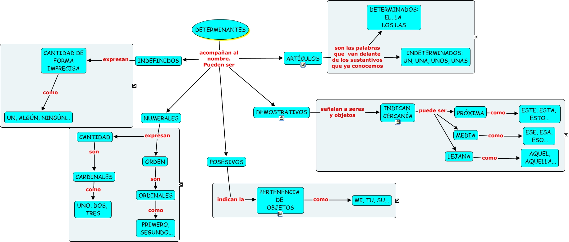Este Cmap, tiene información relacionada con: Determinantes 4º, INDICAN CERCAN�?A puede ser LEJANA, DEMOSTRATIVOS señalan a seres y objetos INDICAN CERCAN�?A, DETERMINANTES acompañan al nombre. Pueden ser ART�?CULOS, LEJANA como AQUEL, AQUELLA..., DETERMINANTES acompañan al nombre. Pueden ser POSESIVOS, INDEFINIDOS expresan CANTIDAD DE FORMA IMPRECISA, CARDINALES como UNO, DOS, TRES, POSESIVOS indican la PERTENENCIA DE OBJETOS, ART�?CULOS son las palabras que van delante de los sustantivos que ya conocemos INDETERMINADOS: UN, UNA, UNOS, UNAS, MEDIA como ESE, ESA, ESO..., DETERMINANTES acompañan al nombre. Pueden ser INDEFINIDOS, CANTIDAD DE FORMA IMPRECISA como UN, ALGÚN, NINGÚN..., ART�?CULOS son las palabras que van delante de los sustantivos que ya conocemos DETERMINADOS: EL, LA LOS LAS, PRÓXIMA como ESTE, ESTA, ESTO..., ORDEN son ORDINALES, INDICAN CERCAN�?A puede ser MEDIA, ORDINALES como PRIMERO, SEGUNDO..., DETERMINANTES acompañan al nombre. Pueden ser NUMERALES, NUMERALES expresan ORDEN, CANTIDAD son CARDINALES