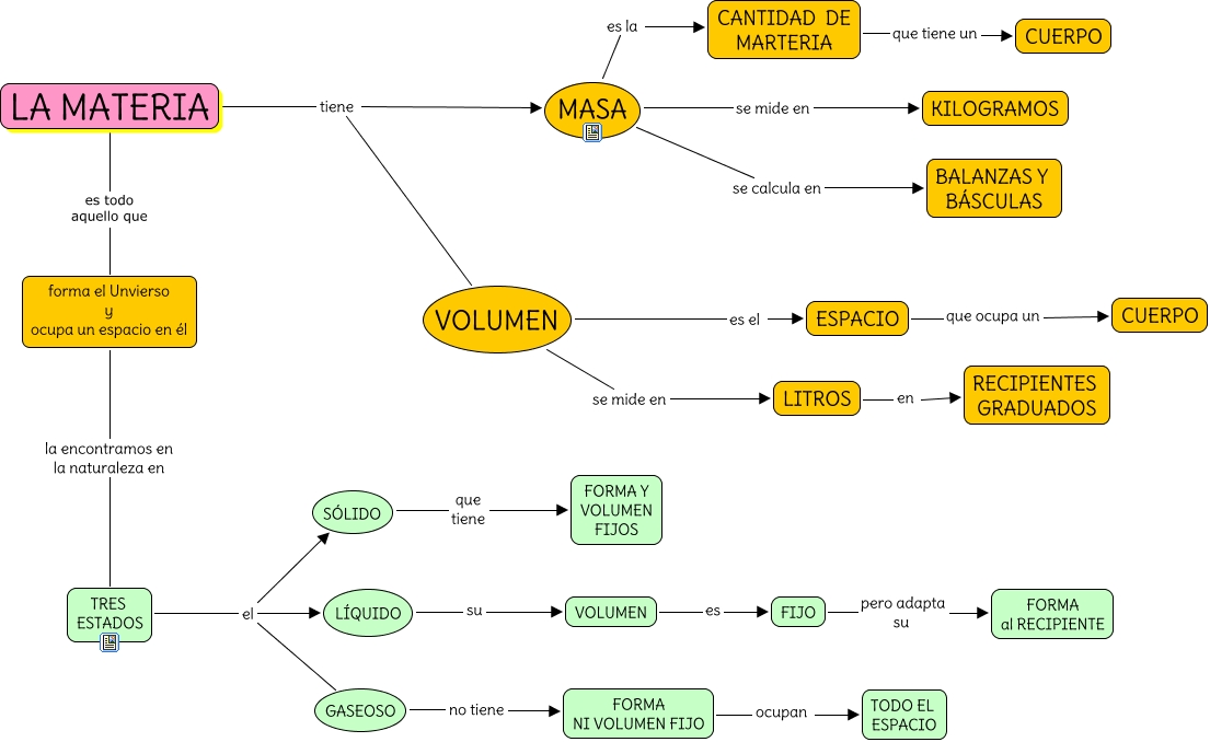 Este Cmap, tiene información relacionada con: 1- LA MATERIA Y SU MEDIDA, FORMA NI VOLUMEN FIJO ocupan TODO EL ESPACIO, MASA se mide en KILOGRAMOS, forma el Unvierso y ocupa un espacio en él la encontramos en la naturaleza en TRES ESTADOS, LA MATERIA es todo aquello que forma el Unvierso y ocupa un espacio en él, FIJO pero adapta su FORMA al RECIPIENTE, LITROS en RECIPIENTES GRADUADOS, SÓLIDO que tiene FORMA Y VOLUMEN FIJOS, MASA se calcula en BALANZAS Y BÁSCULAS, VOLUMEN es el ESPACIO, MASA es la CANTIDAD DE MARTERIA, TRES ESTADOS el GASEOSO, CANTIDAD DE MARTERIA que tiene un CUERPO, ESPACIO que ocupa un CUERPO, LA MATERIA tiene MASA, TRES ESTADOS el LÍQUIDO, LÍQUIDO su VOLUMEN, LA MATERIA tiene VOLUMEN, VOLUMEN se mide en LITROS, VOLUMEN es FIJO, TRES ESTADOS el SÓLIDO
