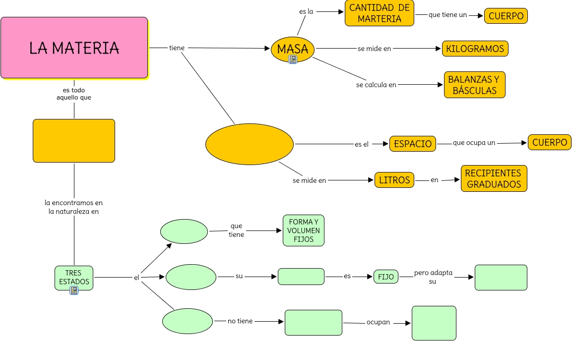 Este Cmap, tiene información relacionada con: LA MATERIA Y SU MEDIDA-MUDO, ESPACIO que ocupa un CUERPO, no tiene, LA MATERIA es todo aquello que, FIJO pero adapta su, su, TRES ESTADOS el, TRES ESTADOS el, LA MATERIA tiene, MASA se calcula en BALANZAS Y BÁSCULAS, CANTIDAD DE MARTERIA que tiene un CUERPO, LITROS en RECIPIENTES GRADUADOS, se mide en LITROS, la encontramos en la naturaleza en TRES ESTADOS, es el ESPACIO, ocupan, TRES ESTADOS el, que tiene FORMA Y VOLUMEN FIJOS, MASA se mide en KILOGRAMOS, MASA es la CANTIDAD DE MARTERIA, es FIJO