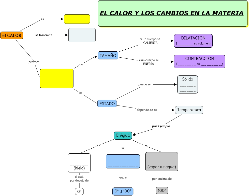 Este Cmap, tiene información relacionada con: EL CALOR Y LOS CAMBIOS-MUDO, El Agua es _____________, de ESTADO, El CALOR provoca, Temperatura por Ejemplo El Agua, El CALOR se transmite, El Agua es ________ (hielo), TAMAÑO si un cuerpo se ENFRIA CONTRACCION (________ su ____________), _____________ entre 0º y 100º, El Agua es _________ (vapor de agua), ESTADO puede ser Sólido _______ _______, ________ (hielo) si está por debajo de 0º, El CALOR es, _________ (vapor de agua) por encima de 100º, ESTADO depende de su Temperatura, de TAMAÑO, TAMAÑO si un cuerpo se CALIENTA DILATACION (_______ su volumen)