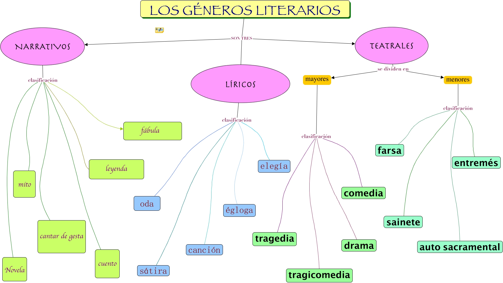 Aquest mapa conceptual conté informació relacionada amb: géneros literarios, menores clasificación sainete, menores clasificación auto sacramental, NARRATIVOS clasificación mito, mayores clasificación tragedia, LÍRICOS clasificación canción, LÍRICOS clasificación égloga, mayores clasificación tragicomedia, LOS GÉNEROS LITERARIOS SON TRES TEATRALES, mayores clasificación drama, NARRATIVOS clasificación cantar de gesta, NARRATIVOS clasificación cuento, LÍRICOS clasificación sátira, LOS GÉNEROS LITERARIOS SON TRES NARRATIVOS, TEATRALES se dividen en mayores, LÍRICOS clasificación elegía, menores clasificación farsa, LOS GÉNEROS LITERARIOS SON TRES LÍRICOS, NARRATIVOS clasificación fábula, menores clasificación entremés, TEATRALES se dividen en menores