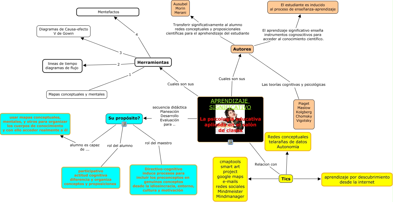Este Cmap, tiene información relacionada con: APRENDIZAJE SIGNIFICATIVO, Su propósito? rol del maestro Directivo-cognitivo induce procesos para incluir los preconceptos en genuinos conceptos desde la idiosincracia, entorno, cultura y motivación, Tics cmaptools smart art project google maps e-mails redes sociales Mindmeister Mindmanager, Su propósito? rol del alumno participativo actitud cognitiva diferencia y organiza conceptos y proposiciones, APRENDIZAJE SIGNIFICATIVO La psicología educativa aplicada en el salón de clases Relacion con Tics, APRENDIZAJE SIGNIFICATIVO La psicología educativa aplicada en el salón de clases Cuales son sus Autores, Herramientas 3 Diagramas de Causa-efecto V de Gowin, Herramientas 2 lineas de tiempo diagramas de flujo, Su propósito? alumno es capaz de ... usar mapas conceptuales, mentales, y otros para organizar los cuerpos de conocimiento y con ello acceder realmente a él, Autores Las teorías cognitivas y psicológicas Piaget Maslow Kolgberg Chomsky Vigotsky, Autores El aprendizaje significativo enseña instrumentos cognoscitivos para acceder al conocimiento científico. El estudiante es inducido al proceso de enseñanza-aprendizaje, Tics aprendizaje por descubrimiento desde la internet, Herramientas 4 Mentefactos, APRENDIZAJE SIGNIFICATIVO La psicología educativa aplicada en el salón de clases secuencia didáctica Planeación Desarrollo Evaluación para .. Su propósito?, APRENDIZAJE SIGNIFICATIVO La psicología educativa aplicada en el salón de clases Cuales son sus Herramientas, Herramientas 1 Mapas conceptuales y mentales, Autores Transferir significativamente al alumno redes conceptuales y proposicionales científicas para el aprehendizaje del estudiante Ausubel Morin Merani, Tics Redes conceptuales telarañas de datos Autonomía