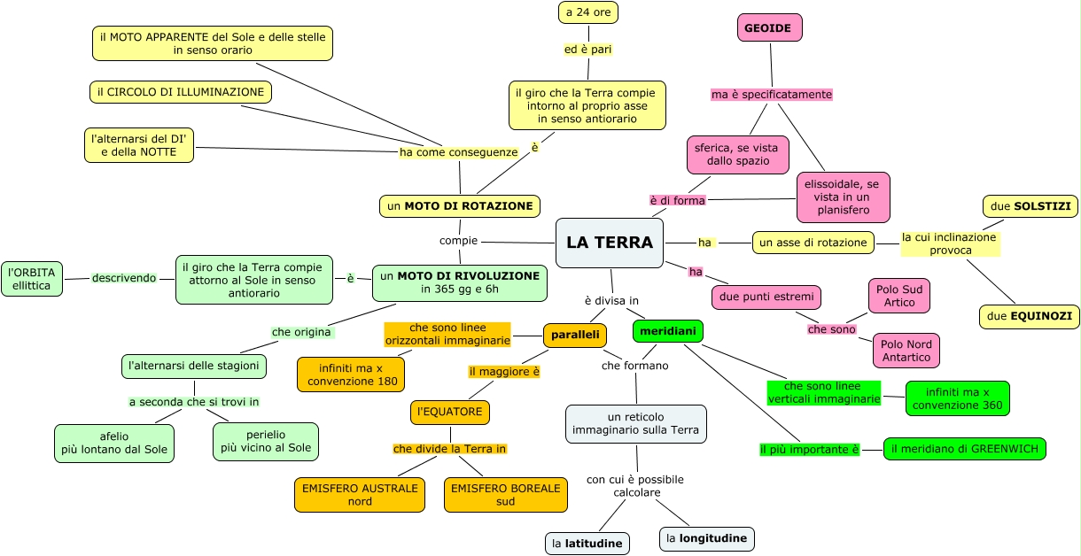 Questa Cmap, creata con IHMC CmapTools, contiene informazioni relative a: terra, LA TERRA compie un MOTO DI RIVOLUZIONE in 365 gg e 6h, LA TERRA ha due punti estremi, l'EQUATORE che divide la Terra in EMISFERO BOREALE sud, LA TERRA ha un asse di rotazione, meridiani il più importante è il meridiano di GREENWICH, LA TERRA è divisa in meridiani, due punti estremi che sono Polo Nord Antartico, la longitudine con cui è possibile calcolare la latitudine, l'alternarsi delle stagioni a seconda che si trovi in afelio più lontano dal Sole, meridiani che sono linee verticali immaginarie infiniti ma x convenzione 360, elissoidale, se vista in un planisfero ma è specificatamente sferica, se vista dallo spazio, paralleli che sono linee orizzontali immaginarie infiniti ma x convenzione 180, paralleli che formano meridiani, un MOTO DI ROTAZIONE ha come conseguenze il CIRCOLO DI ILLUMINAZIONE, l'EQUATORE che divide la Terra in EMISFERO AUSTRALE nord, un MOTO DI ROTAZIONE è il giro che la Terra compie intorno al proprio asse in senso antiorario, un MOTO DI ROTAZIONE ha come conseguenze il MOTO APPARENTE del Sole e delle stelle in senso orario, elissoidale, se vista in un planisfero ma è specificatamente GEOIDE, un MOTO DI ROTAZIONE ha come conseguenze l'alternarsi del DI' e della NOTTE, la longitudine con cui è possibile calcolare un reticolo immaginario sulla Terra