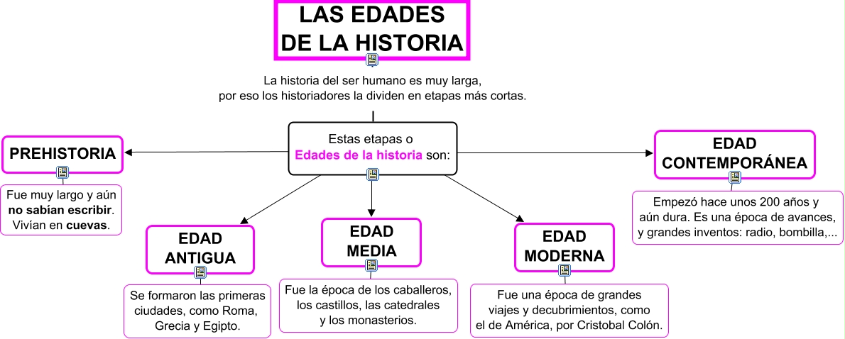 Este Cmap, tiene información relacionada con: LAS EDADES DE LA HISTORIA, Estas etapas o Edades de la historia son: ???? EDAD ANTIGUA, PREHISTORIA ???? Fue muy largo y aún no sabían escribir. Vivían en cuevas., LAS EDADES DE LA HISTORIA La historia del ser humano es muy larga, por eso los historiadores la dividen en etapas más cortas. Estas etapas o Edades de la historia son:, EDAD ANTIGUA ???? Se formaron las primeras ciudades, como Roma, Grecia y Egipto., EDAD CONTEMPORÁNEA ???? Empezó hace unos 200 años y aún dura. Es una época de avances, y grandes inventos: radio, bombilla,..., EDAD MODERNA ???? Fue una época de grandes viajes y decubrimientos, como el de América, por Cristobal Colón., EDAD MEDIA ???? Fue la época de los caballeros, los castillos, las catedrales y los monasterios., Estas etapas o Edades de la historia son: ???? EDAD MEDIA, Estas etapas o Edades de la historia son: ???? EDAD CONTEMPORÁNEA, Estas etapas o Edades de la historia son: ???? PREHISTORIA, Estas etapas o Edades de la historia son: ???? EDAD MODERNA