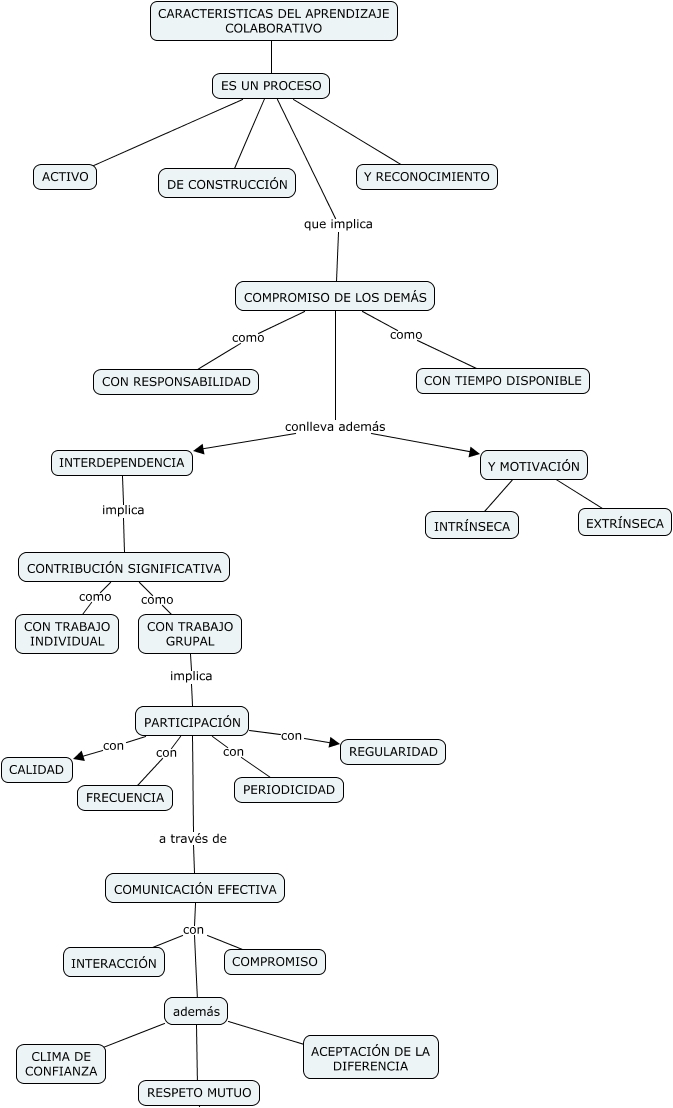 Este Cmap, tiene información relacionada con: Mapa Aprendizaje Colaborativo - María Liliana Velásquez, CONTRIBUCIÓN SIGNIFICATIVA como CON TRABAJO GRUPAL, COMPROMISO DE LOS DEMÁS como CON TIEMPO DISPONIBLE, PARTICIPACIÓN con CALIDAD, ES UN PROCESO ???? ACTIVO, además ???? ACEPTACIÓN DE LA DIFERENCIA, ES UN PROCESO ???? DE CONSTRUCCIÓN, ES UN PROCESO que implica COMPROMISO DE LOS DEMÁS, PARTICIPACIÓN con FRECUENCIA, INTERDEPENDENCIA implica CONTRIBUCIÓN SIGNIFICATIVA, COMPROMISO DE LOS DEMÁS conlleva además Y MOTIVACIÓN, además ???? CLIMA DE CONFIANZA, CARACTERISTICAS DEL APRENDIZAJE COLABORATIVO ???? ES UN PROCESO, COMPROMISO DE LOS DEMÁS conlleva además INTERDEPENDENCIA, COMUNICACIÓN EFECTIVA con ????, PARTICIPACIÓN con PERIODICIDAD, CONTRIBUCIÓN SIGNIFICATIVA como CON TRABAJO INDIVIDUAL, CON TRABAJO GRUPAL implica PARTICIPACIÓN, ES UN PROCESO ???? Y RECONOCIMIENTO, PARTICIPACIÓN con REGULARIDAD, EXTRÍNSECA ???? Y MOTIVACIÓN