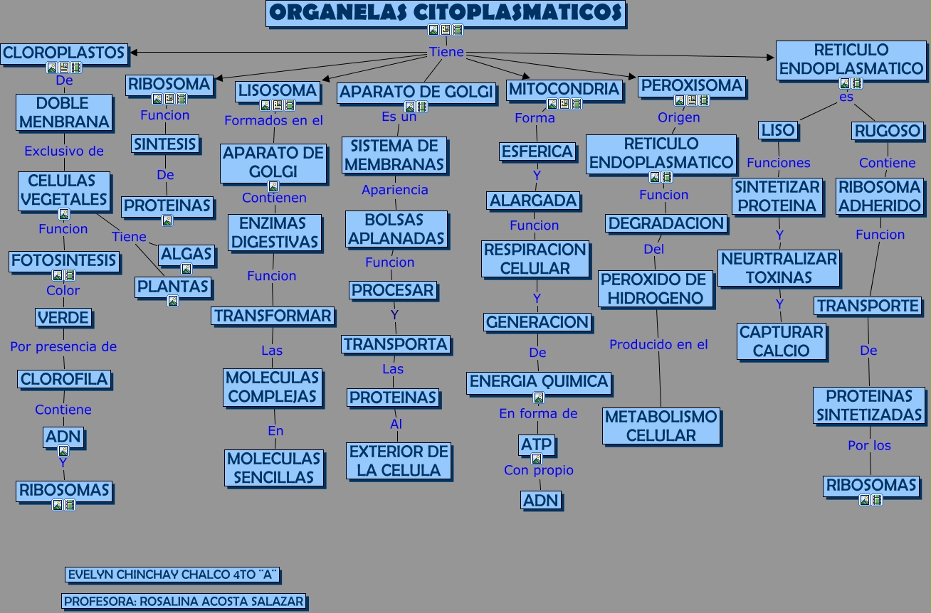Este Cmap, tiene información relacionada con: organelas citoplasmaticos, LISOSOMA Formados en el APARATO DE GOLGI, MITOCONDRIA Forma ESFERICA, RESPIRACION CELULAR Y GENERACION, DEGRADACION Del PEROXIDO DE HIDROGENO, CLOROPLASTOS De DOBLE MENBRANA, DOBLE MENBRANA Exclusivo de CELULAS VEGETALES, LISO Funciones SINTETIZAR PROTEINA, SINTETIZAR PROTEINA Y NEURTRALIZAR TOXINAS, RETICULO ENDOPLASMATICO Funcion DEGRADACION, ORGANELAS CITOPLASMATICOS Tiene APARATO DE GOLGI, CELULAS VEGETALES Tiene ALGAS, SINTESIS De PROTEINAS, RETICULO ENDOPLASMATICO es RUGOSO, CLOROFILA Contiene ADN, ORGANELAS CITOPLASMATICOS Tiene PEROXISOMA, ORGANELAS CITOPLASMATICOS Tiene CLOROPLASTOS, ESFERICA Y ALARGADA, BOLSAS APLANADAS Funcion PROCESAR, CELULAS VEGETALES Funcion FOTOSINTESIS, CELULAS VEGETALES Tiene PLANTAS