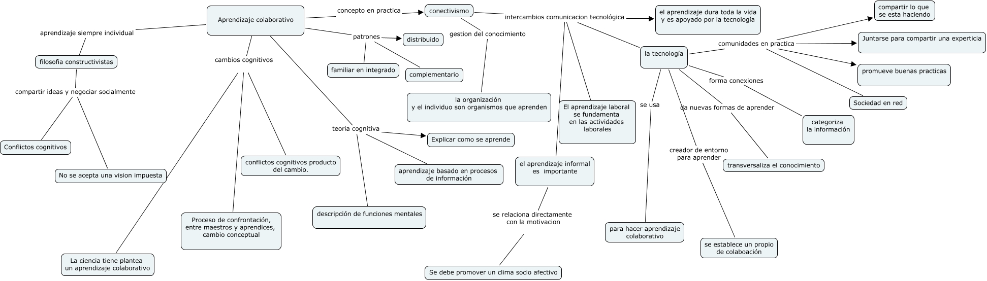 Este Cmap, tiene información relacionada con: aprendizaje_colaborativo_Alvaro_Cifuentes, filosofia constructivistas compartir ideas y negociar socialmente No se acepta una vision impuesta, Aprendizaje colaborativo patrones distribuido, Aprendizaje colaborativo cambios cognitivos La ciencia tiene plantea un aprendizaje colaborativo, Aprendizaje colaborativo concepto en practica conectivismo, la tecnología comunidades en practica compartir lo que se esta haciendo, la tecnología comunidades en practica Sociedad en red, conectivismo gestion del conocimiento la organización y el individuo son organismos que aprenden, conectivismo intercambios comunicacion tecnológica El aprendizaje laboral se fundamenta en las actividades laborales, el aprendizaje informal es importante se relaciona directamente con la motivacion Se debe promover un clima socio afectivo, la tecnología creador de entorno para aprender se establece un propio de colaboación, la tecnología comunidades en practica promueve buenas practicas, la tecnología da nuevas formas de aprender transversaliza el conocimiento, la tecnología comunidades en practica Juntarse para compartir una experticia, la tecnología se usa para hacer aprendizaje colaborativo, Aprendizaje colaborativo teoria cognitiva Explicar como se aprende, conectivismo intercambios comunicacion tecnológica la tecnología, filosofia constructivistas compartir ideas y negociar socialmente Conflictos cognitivos, Aprendizaje colaborativo cambios cognitivos conflictos cognitivos producto del cambio., conectivismo intercambios comunicacion tecnológica el aprendizaje informal es importante, Aprendizaje colaborativo cambios cognitivos Proceso de confrontación, entre maestros y aprendices, cambio conceptual