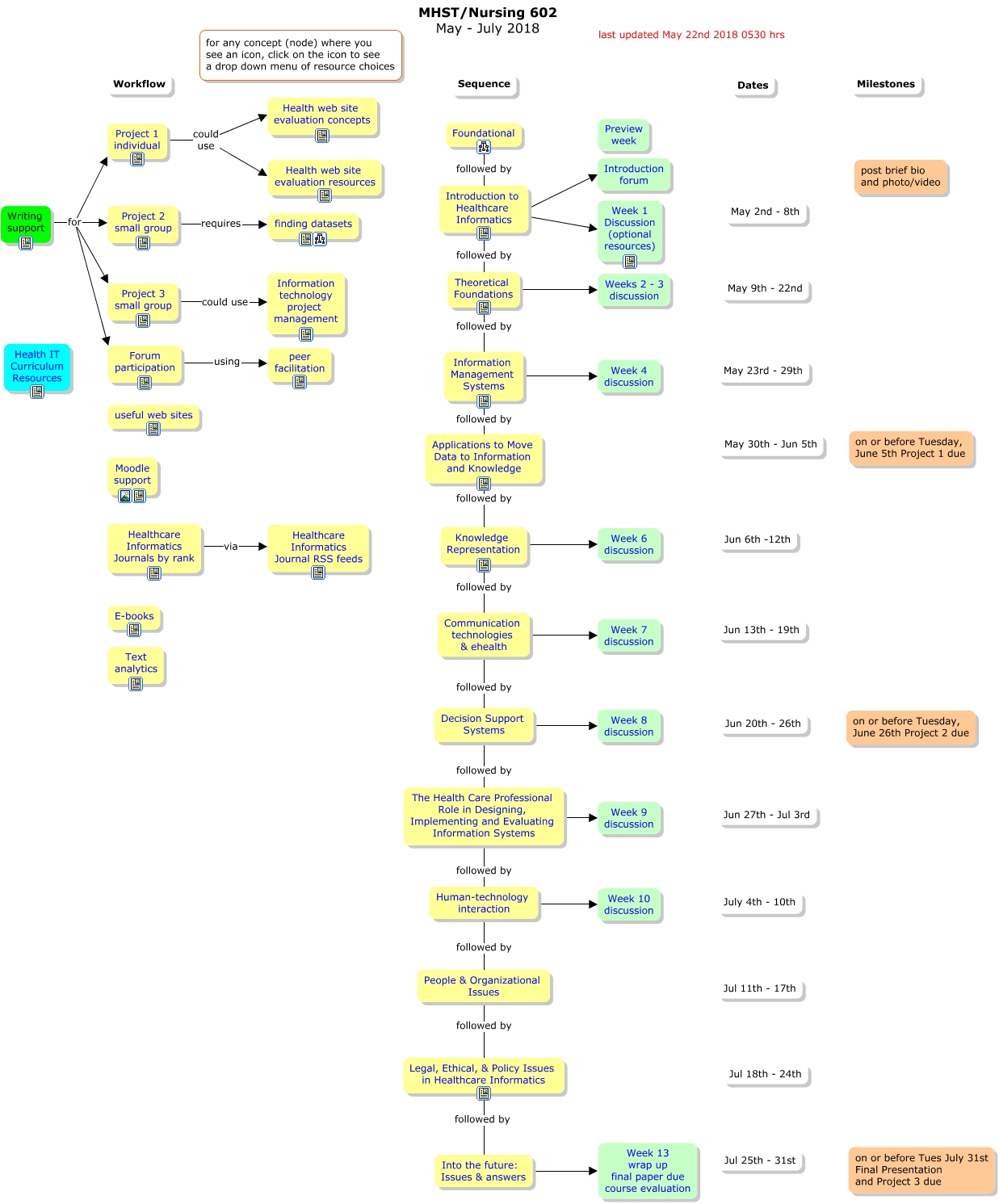 This Concept Map, created with IHMC CmapTools, has information related to: 602Told, Legal, Ethical, & Policy Issues in Healthcare Informatics followed by Into the future: Issues & answers, The Health Care Professional Role in Designing, Implementing and Evaluating Information Systems Week 9 discussion, Knowledge Representation followed by Communication technologies & ehealth, Information Management Systems Week 4 discussion, Information Management Systems followed by Applications to Move Data to Information and Knowledge, Decision Support Systems Week 8 discussion, Decision Support Systems followed by The Health Care Professional Role in Designing, Implementing and Evaluating Information Systems, Writing support for Project 3 small group, Theoretical Foundations Weeks 2 - 3 discussion, Writing support for Forum participation, Project 3 small group could use Information technology project management, Theoretical Foundations followed by Information Management Systems, Writing support for Project 1 individual, Foundational followed by Introduction to Healthcare Informatics, Healthcare Informatics Journals by rank via Healthcare Informatics Journal RSS feeds, Project 1 individual could use Health web site evaluation resources, Forum participation using peer facilitation, Writing support for Project 2 small group, Human-technology interaction followed by People & Organizational Issues, Applications to Move Data to Information and Knowledge followed by Knowledge Representation