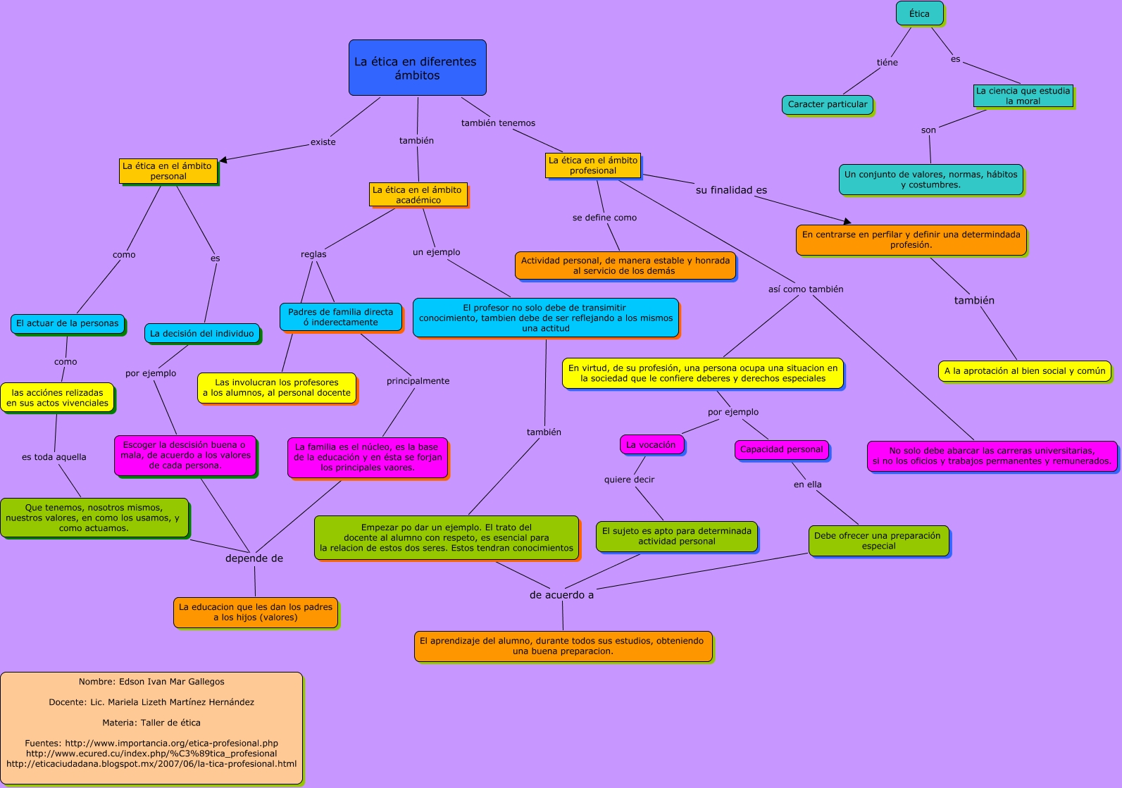 Este Cmap, tiene información relacionada con: edson ivan Etica, Padres de familia directa ó inderectamente principalmente La familia es el núcleo, es la base de la educación y en ésta se forjan los principales vaores., La ética en el ámbito profesional así como también En virtud, de su profesión, una persona ocupa una situacion en la sociedad que le confiere deberes y derechos especiales, En centrarse en perfilar y definir una determindada profesión. también A la aprotación al bien social y común, Capacidad personal en ella Debe ofrecer una preparación especial, La ética en el ámbito profesional su finalidad es En centrarse en perfilar y definir una determindada profesión., La ética en diferentes ámbitos también La ética en el ámbito académico, Que tenemos, nosotros mismos, nuestros valores, en como los usamos, y como actuamos. depende de La educacion que les dan los padres a los hijos (valores), Ética tiéne Caracter particular, La vocación quiere decir El sujeto es apto para determinada actividad personal, En virtud, de su profesión, una persona ocupa una situacion en la sociedad que le confiere deberes y derechos especiales por ejemplo Capacidad personal, La ética en diferentes ámbitos también tenemos La ética en el ámbito profesional, La ciencia que estudia la moral son Un conjunto de valores, normas, hábitos y costumbres., La ética en el ámbito académico un ejemplo El profesor no solo debe de transimitir conocimiento, tambien debe de ser reflejando a los mismos una actitud, las acciónes relizadas en sus actos vivenciales es toda aquella Que tenemos, nosotros mismos, nuestros valores, en como los usamos, y como actuamos., La ética en diferentes ámbitos existe La ética en el ámbito personal, Debe ofrecer una preparación especial de acuerdo a El aprendizaje del alumno, durante todos sus estudios, obteniendo una buena preparacion., La ética en el ámbito profesional se define como Actividad personal, de manera estable y honrada al servicio de los demás, La ética en el ámbito personal es La decisión del individuo, El profesor no solo debe de transimitir conocimiento, tambien debe de ser reflejando a los mismos una actitud también Empezar po dar un ejemplo. El trato del docente al alumno con respeto, es esencial para la relacion de estos dos seres. Estos tendran conocimientos, La ética en el ámbito académico reglas Padres de familia directa ó inderectamente